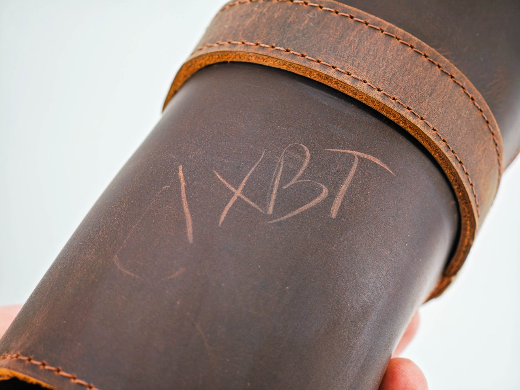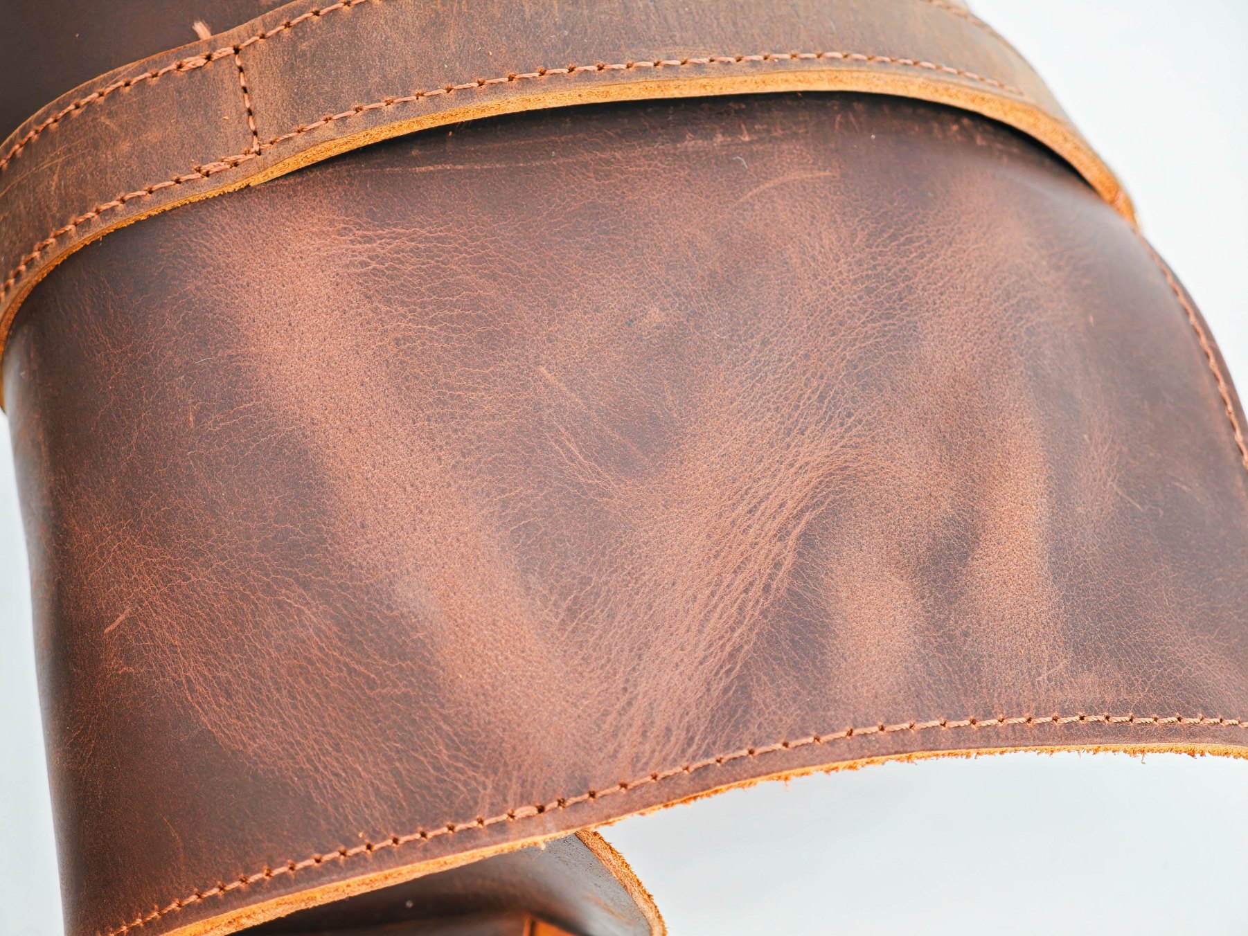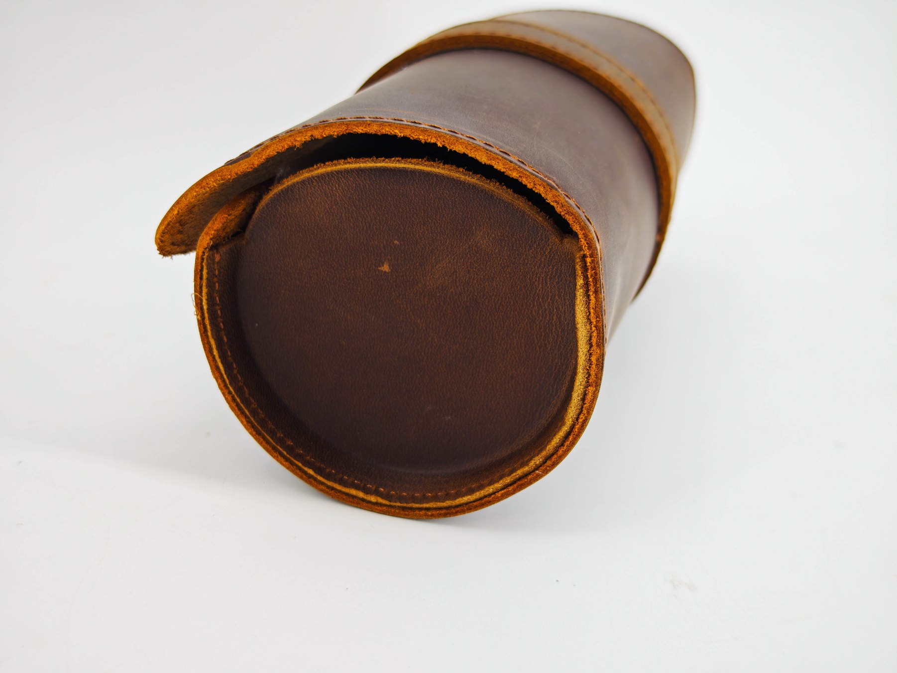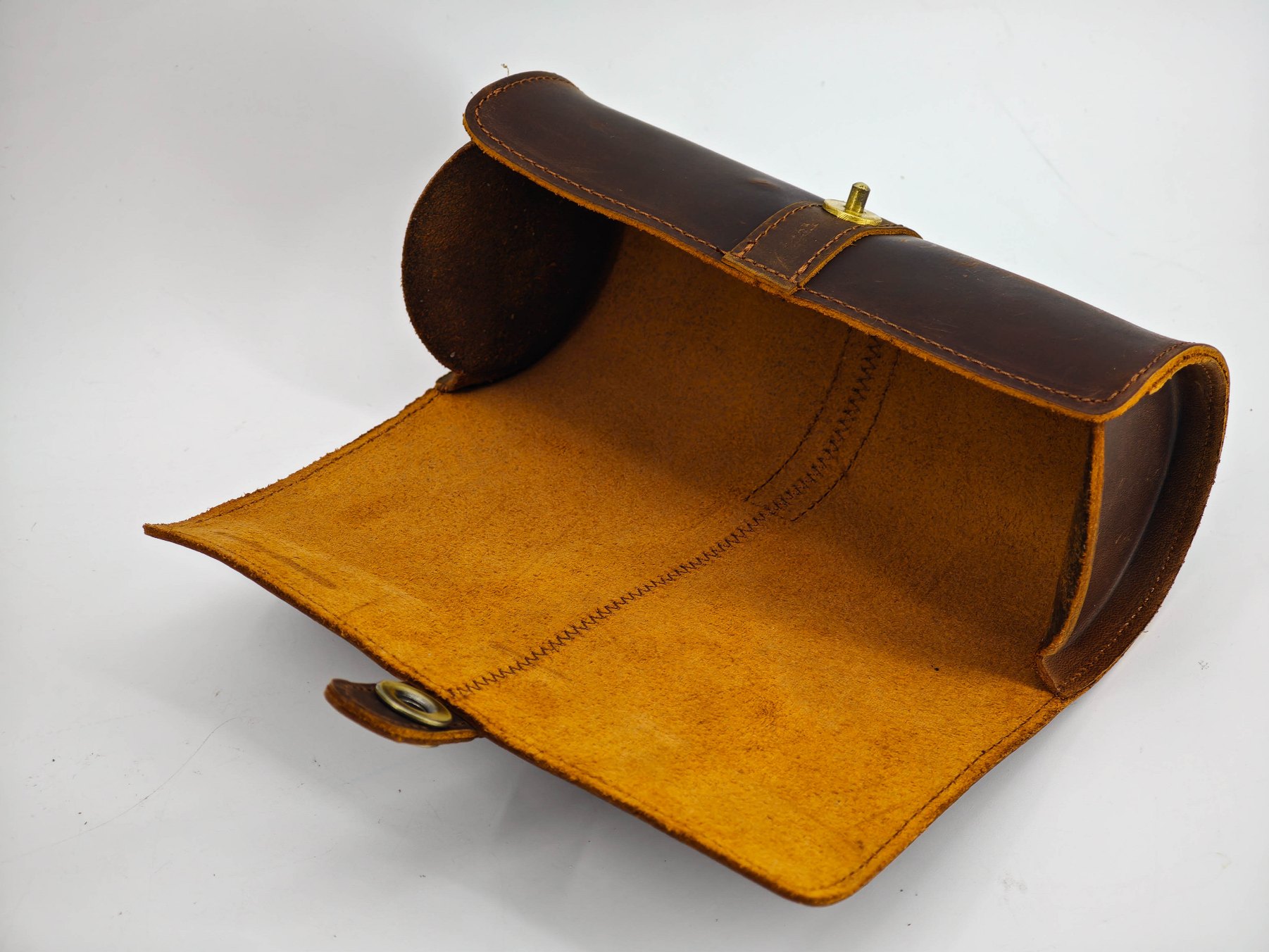 Чехол-футляр сшит из кусочков натуральной кожи, это хорошо видно на торцах кроя. Шов машинный, но в целом производит приятное впечатление. Торцы не обработаны, но все детали ровные. Внутренняя поверхность не обработана — там присутствует мягкая бахтарма натуральной кожи.