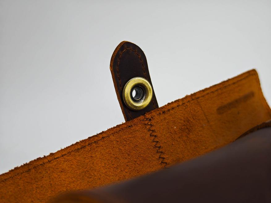 В качестве фурнитуры для фиксации используется большая кнопка из стали латуни. Ответная часть также из латуни. Такое решение придает особый шарм ретро-эстетики, так как латунь со временем покрывается патиной, но и одновременно хорошо поддается полировки.