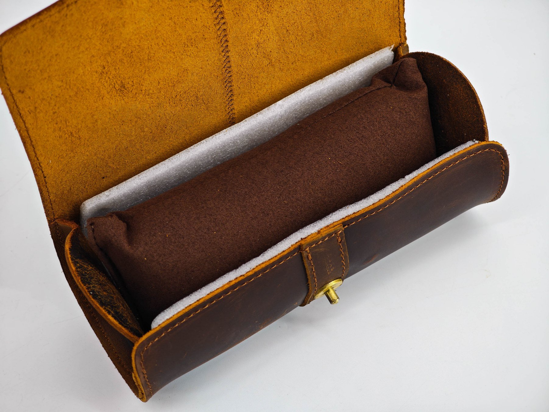 Как я уже сказал, для установки часов внутри предусмотрен небольшой валик по размеру футляра. Это рулон из мягкого материала с наполнителем, в цвет кожи, предназначенный для фиксации на нем браслетов и ремешков.
