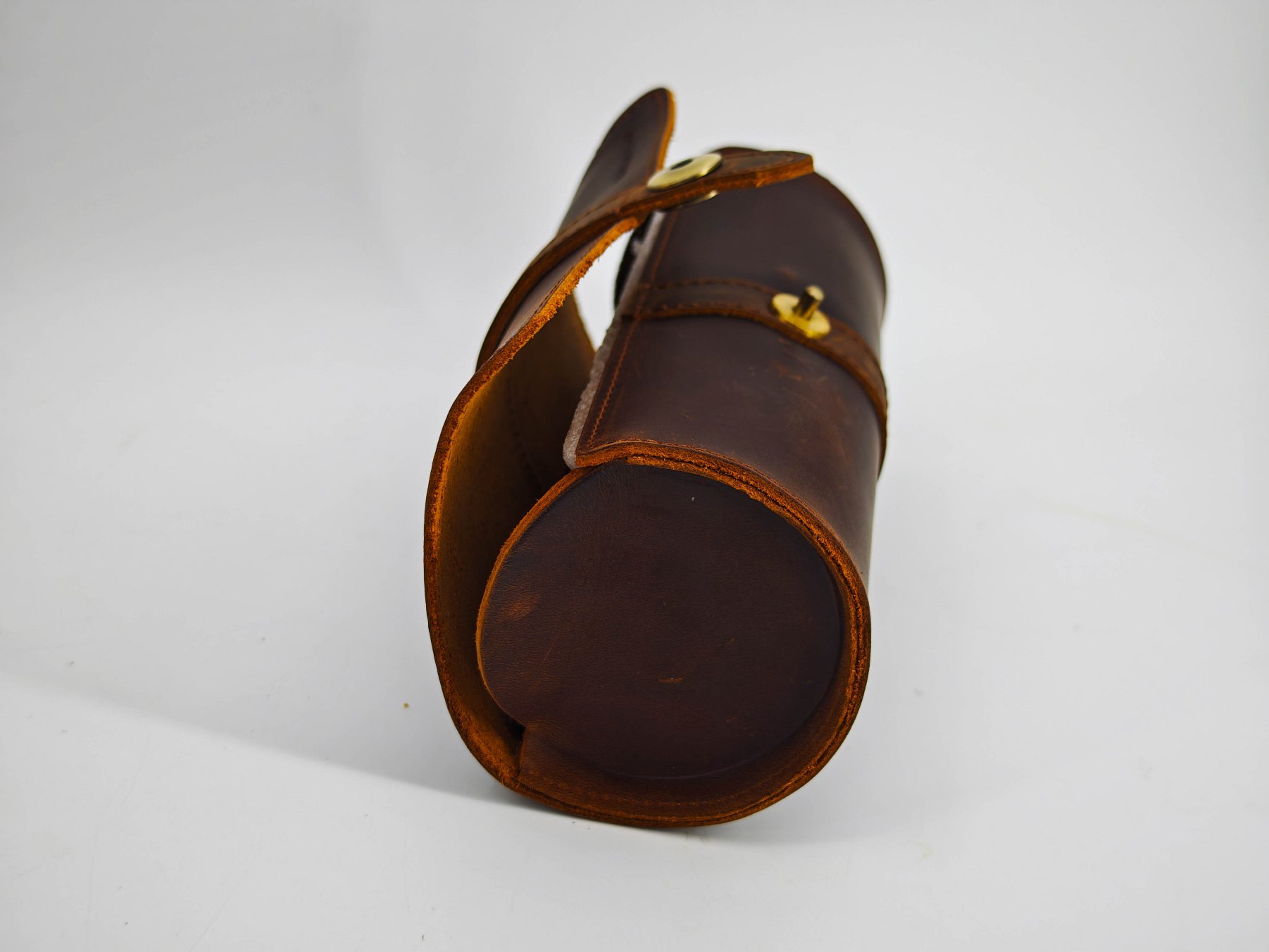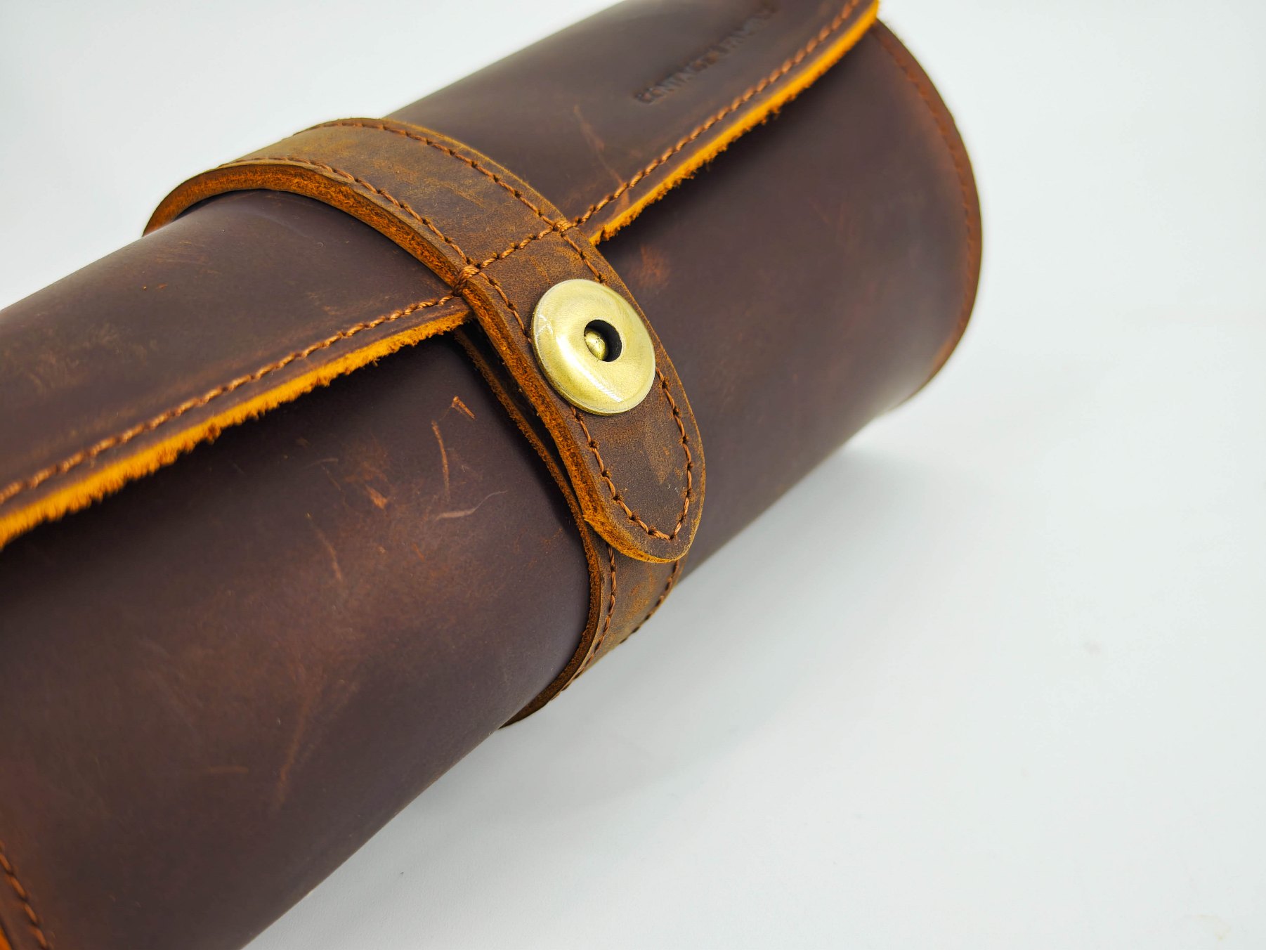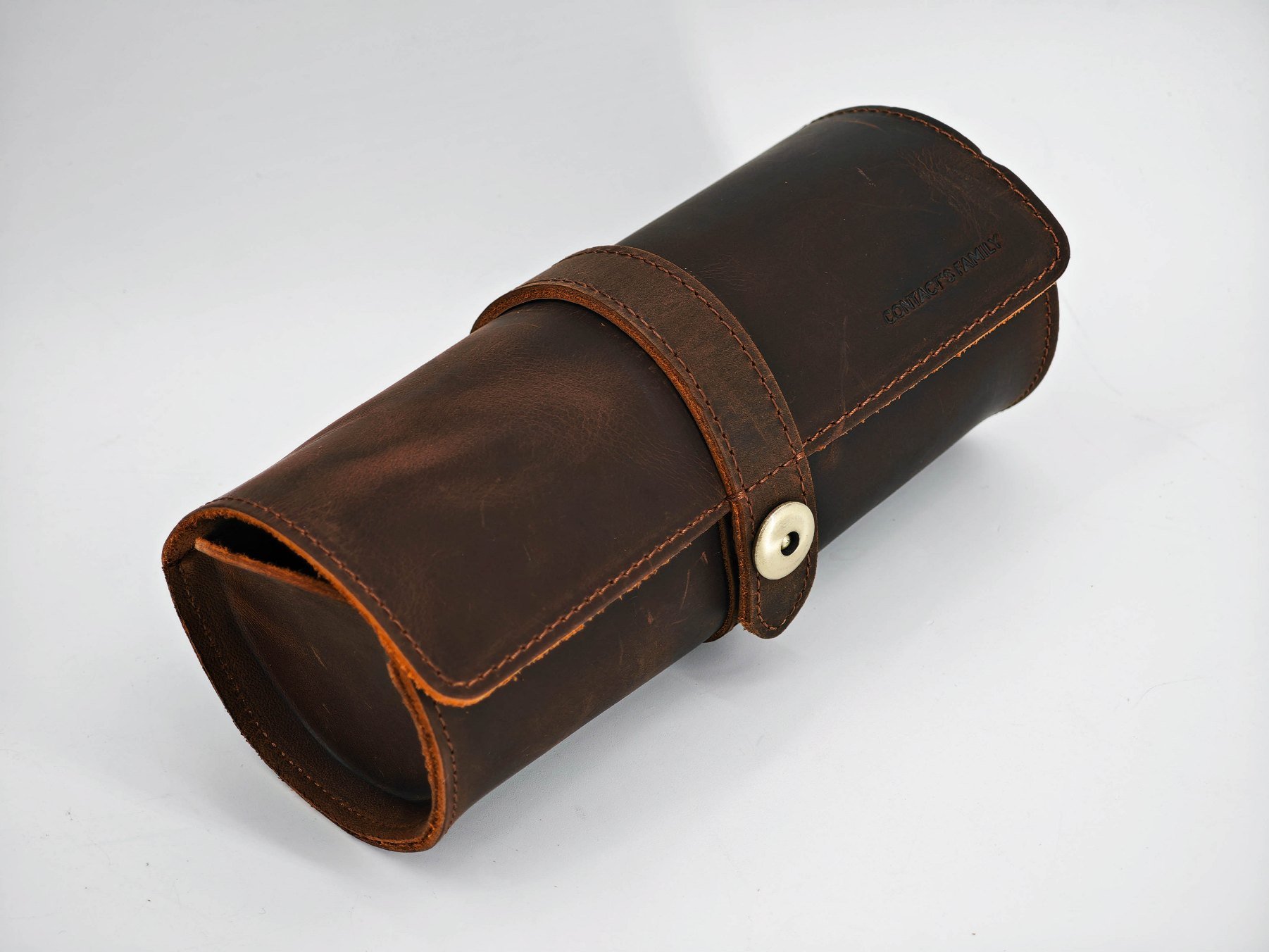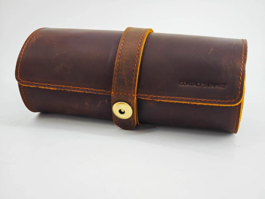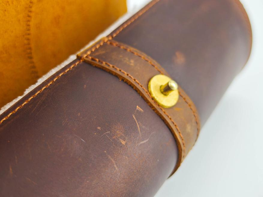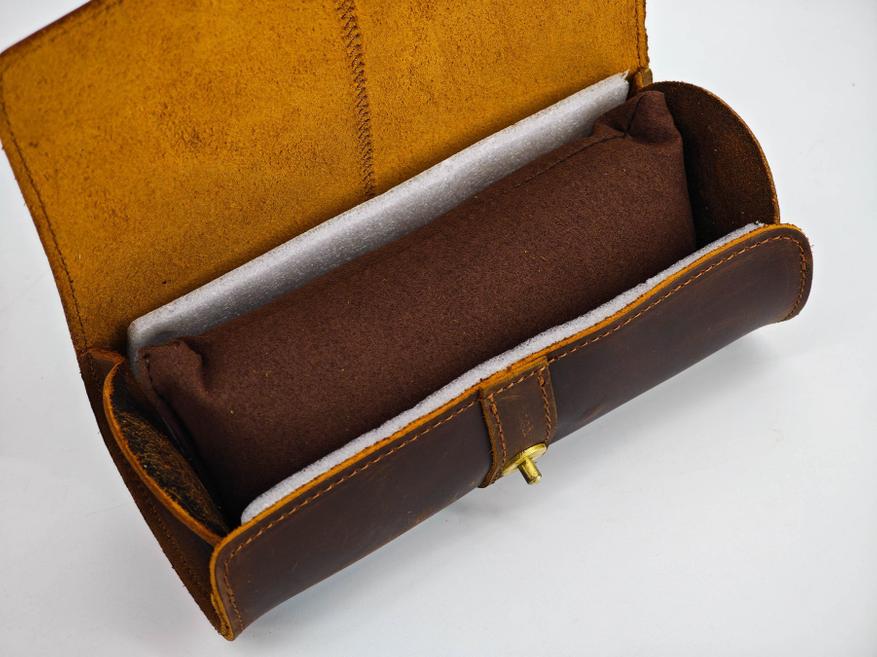 Да, за часами тоже нужно ухаживать и хранить соответствующим образом. Именно по этой причине я выбрал вот такой винтажный органайзер-футляр из натуральной кожи. Представляет собой футляр-скрутку с мягкой вставкой внутри. Размеры в длину 18.5 сантиметров. Диаметр «рулона» около 8 сантиметров. Кнопка чуть-чуть выступает за общий габарит чехла. Весит пустой футляр около 150 граммов (без часов, но с «мешочками»). У меня вариант в «кофейном» цвете, но можно найти и в черной коже.