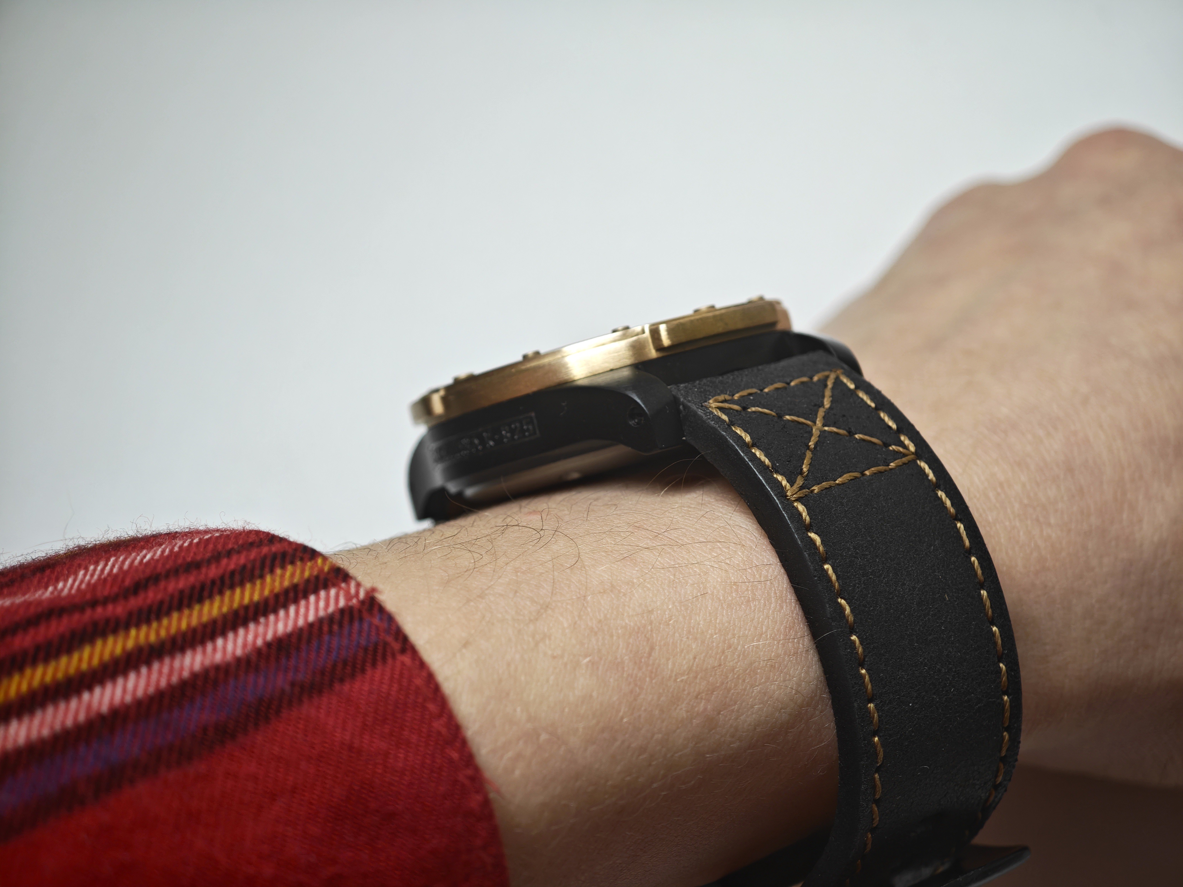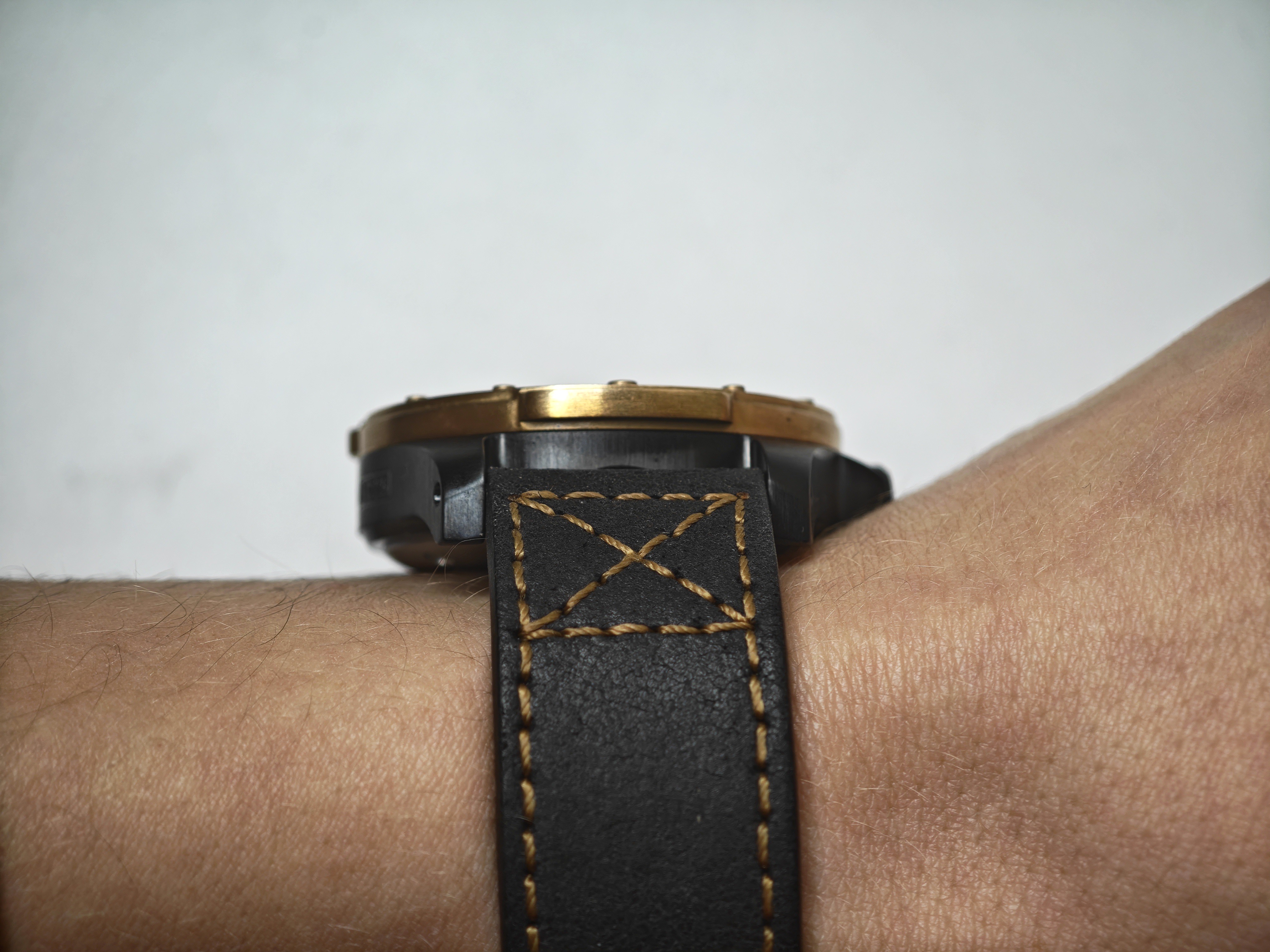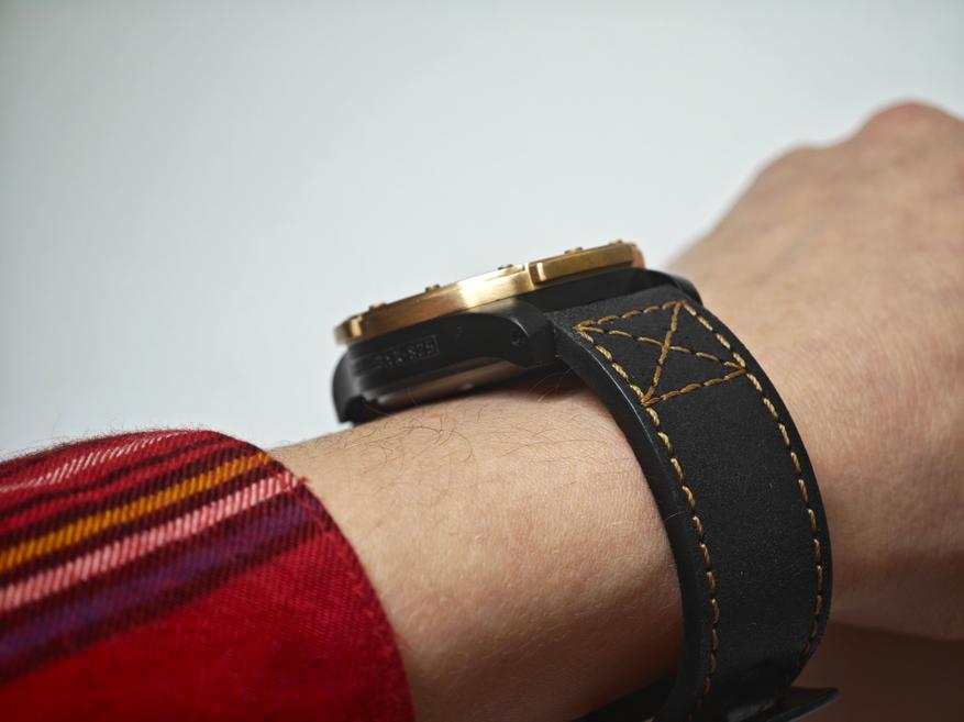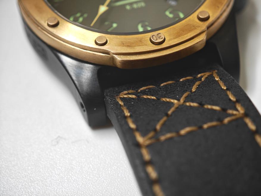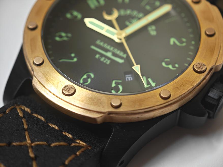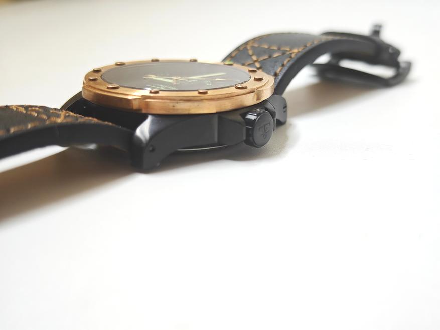 Свою бронзовость модель сохраняет только из-за безеля, который, к слову, тоже имеет оригинальный вид. Отсылая не то к иллюминатору, не то к скафандру, он получил дополнительные выступы для удобства при вращении. Болтам-меткам добавили немного функциональности, сделав засечки на 3/6 и 9.