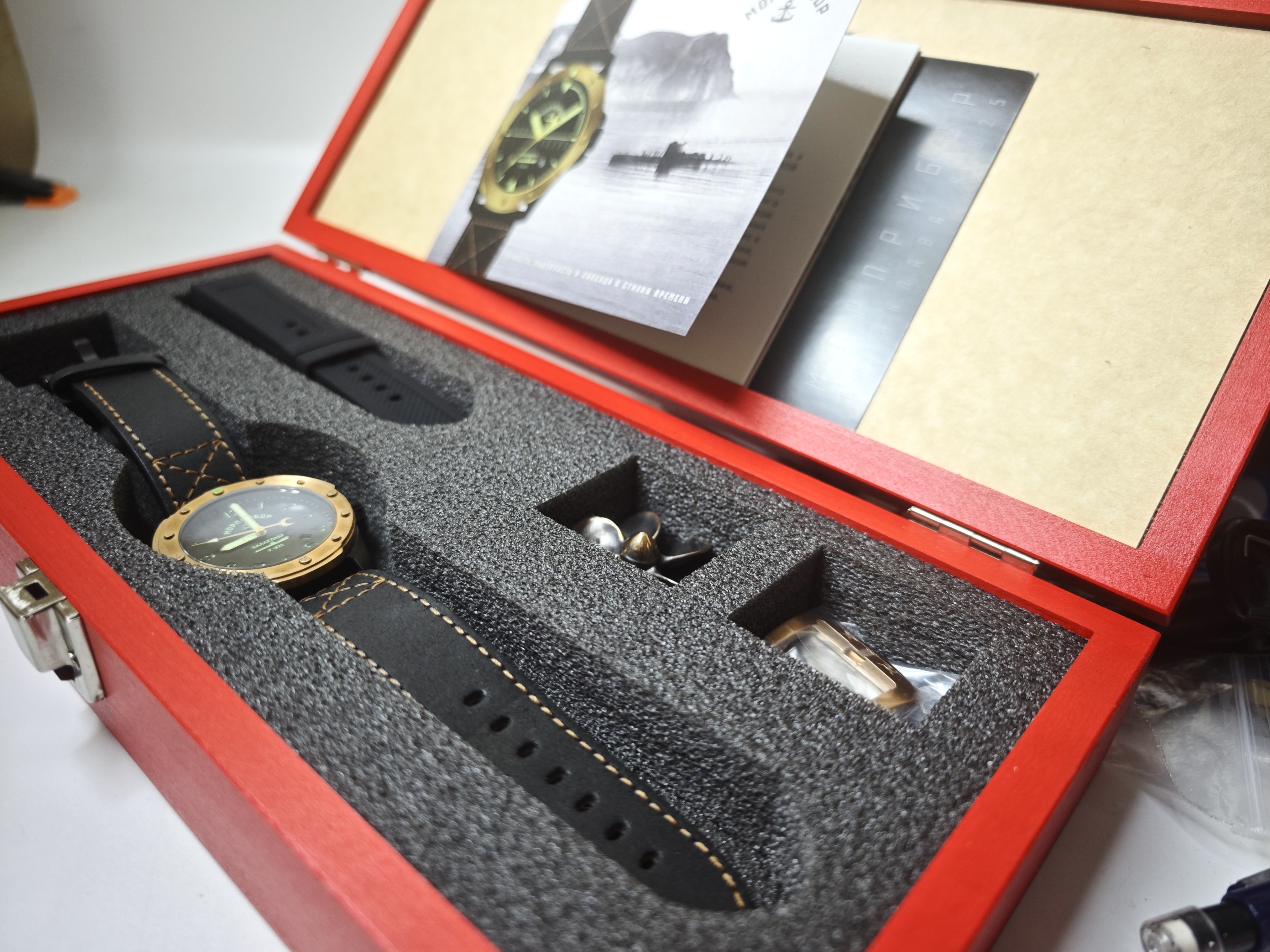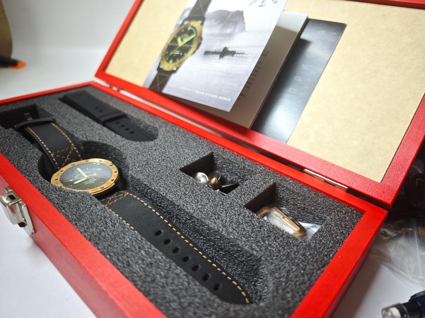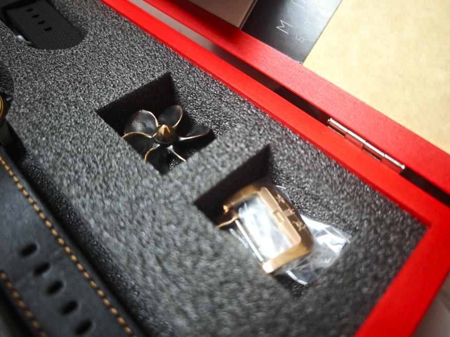 Часы получили каноничное для бренда оформление: это крупная деревянная коробка, презентабельная, внутри которой к часам добавлены и сувениры, и дополнительные расходники (ремешок, пряжка).
