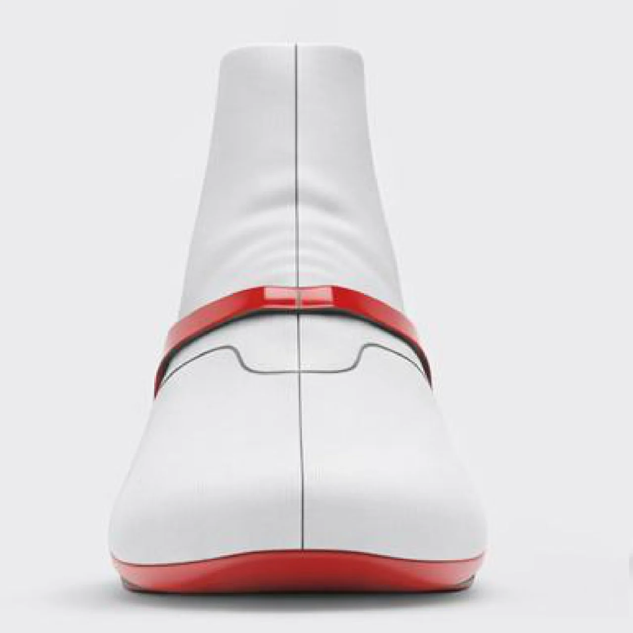 Конструкция обуви состоит из двух основных элементов. Верхняя часть выполнена из белого бесшовного материала, который надевается на ногу по принципу носка. В модели отсутствуют традиционные застежки, швы и металлическая фурнитура.
