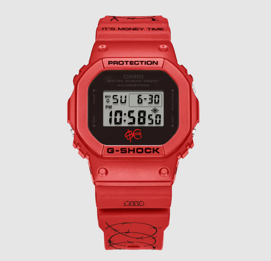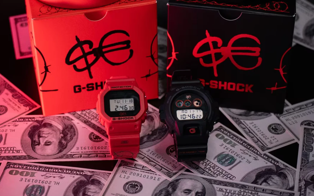 Бренд G-Shock Italy представил две новые лимитированные модели часов, созданные в сотрудничестве с популярным итальянским рэпером Сферой Эббастой. Новинки выпускаются в двух вариантах: красный DW-5600SFE25-4 и черный DW-6900SFE25-1. Обе модели имеют ремешки с узором колючей проволоки и надписью «It's Money Time».