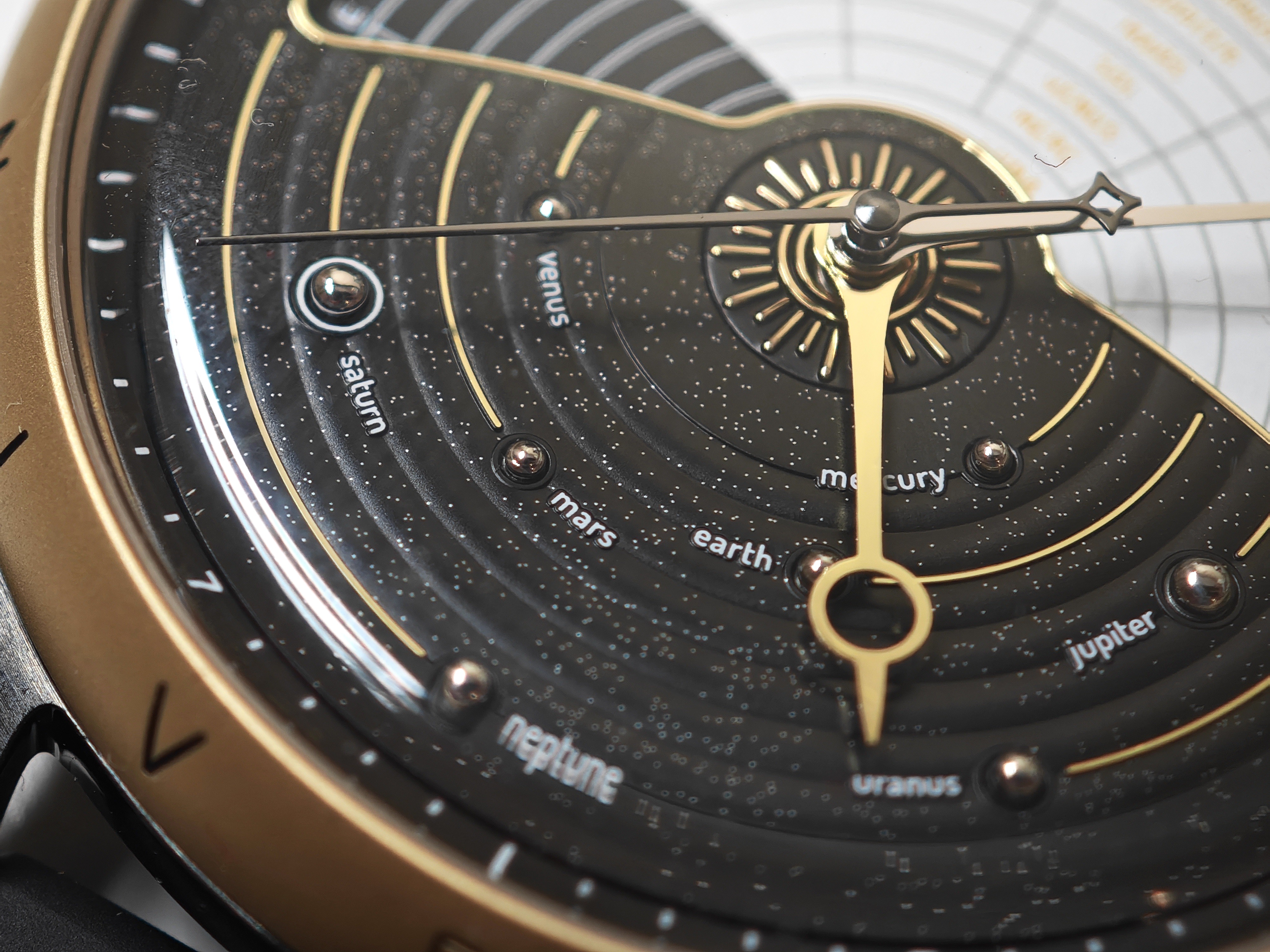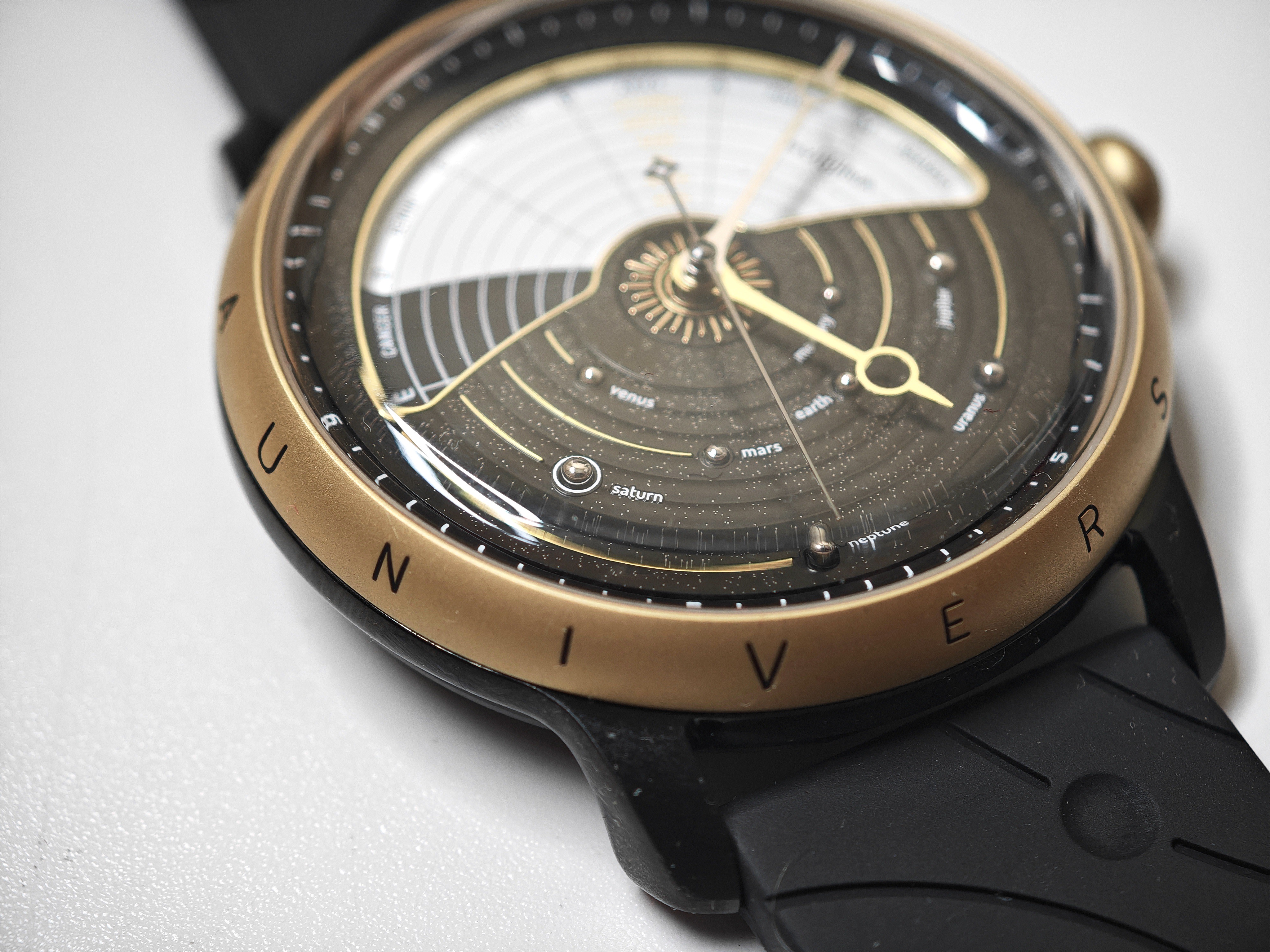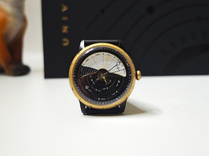 Дизайн модели продуман и проработан, детали хорошо ладят между собой, работая на общую идею. Интересно выглядит многоуровневый циферблат, а статичный планетарий внизу уравновешивает динамика сверху.