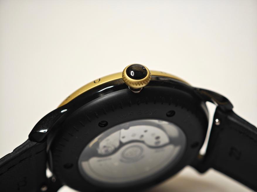 Даже заводная головка этого корпуса наталкивает на размышления о солнце и тьме. А насечки — едва ли не лучи!
