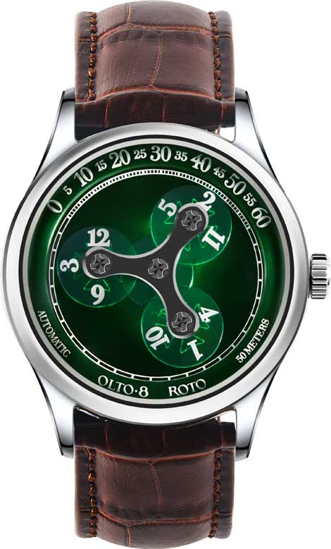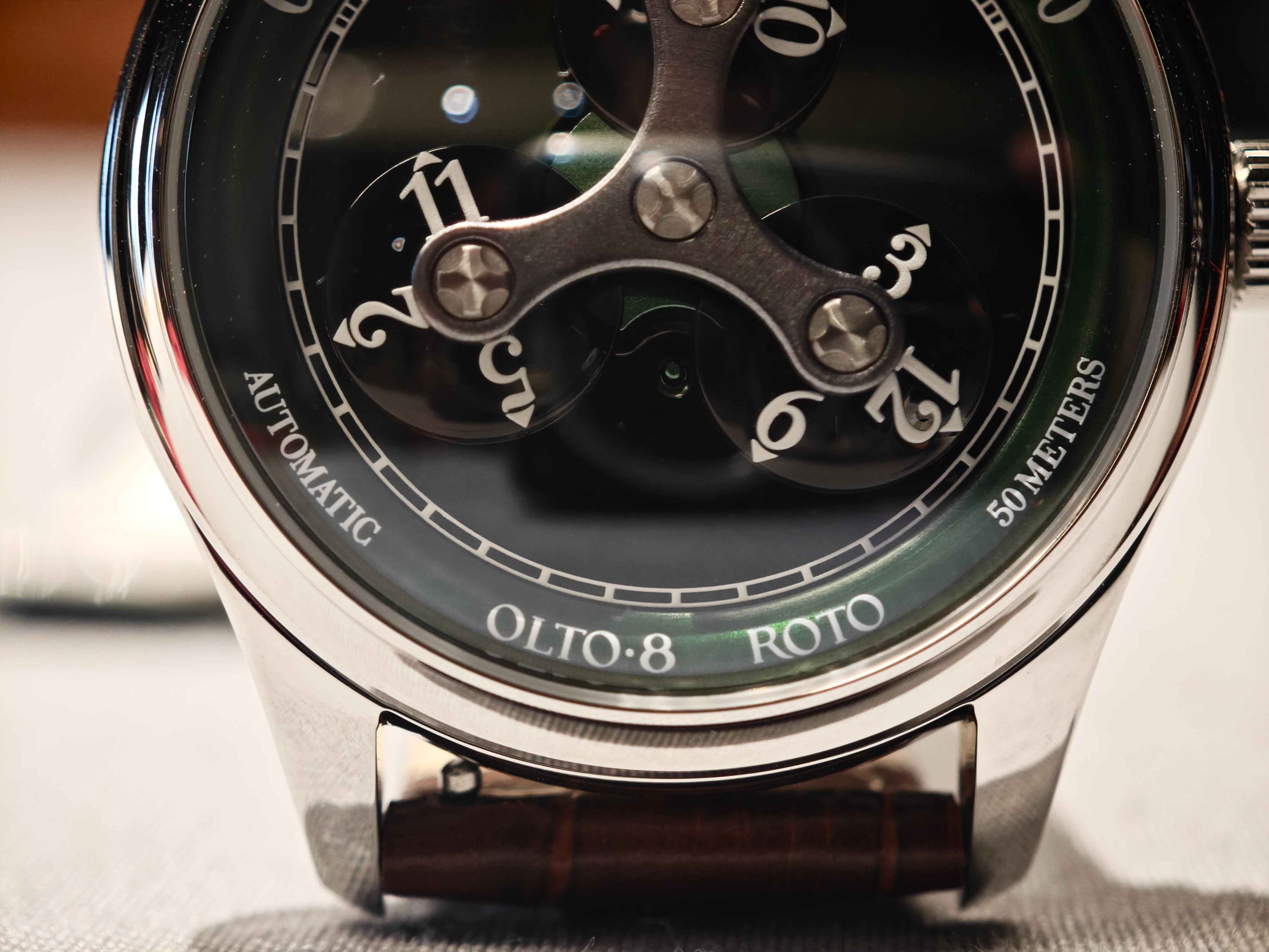 Хотя о специфике часов такого типа мы уже коротко говорили в обзоре модели Atowak, все же стоит напомнить и о «геометрии» этого усложнения. Сегодня наиболее распространенной формой «стрелок» являются круг и прямоугольник/пирамидка/трапеция. Atowak — были из тех моделей, что размещают часы на гранях, OLTO-8 делают и так, и эдак: