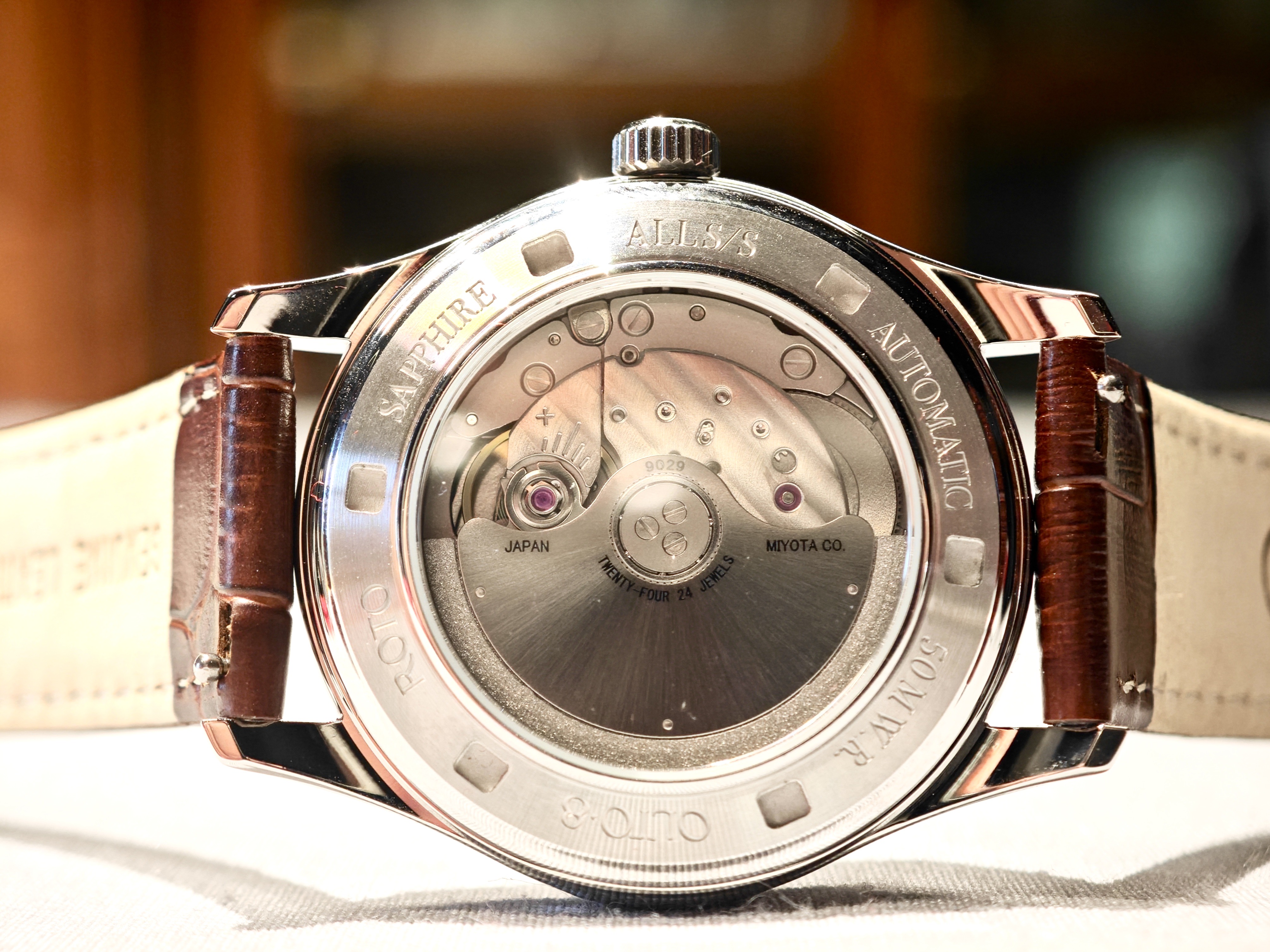 Внутри располагается механизм Miyota премиальной 90-й серии, модифицированный под усложнение блуждающего часа. Калибр просматривается через прозрачную крышку часов: