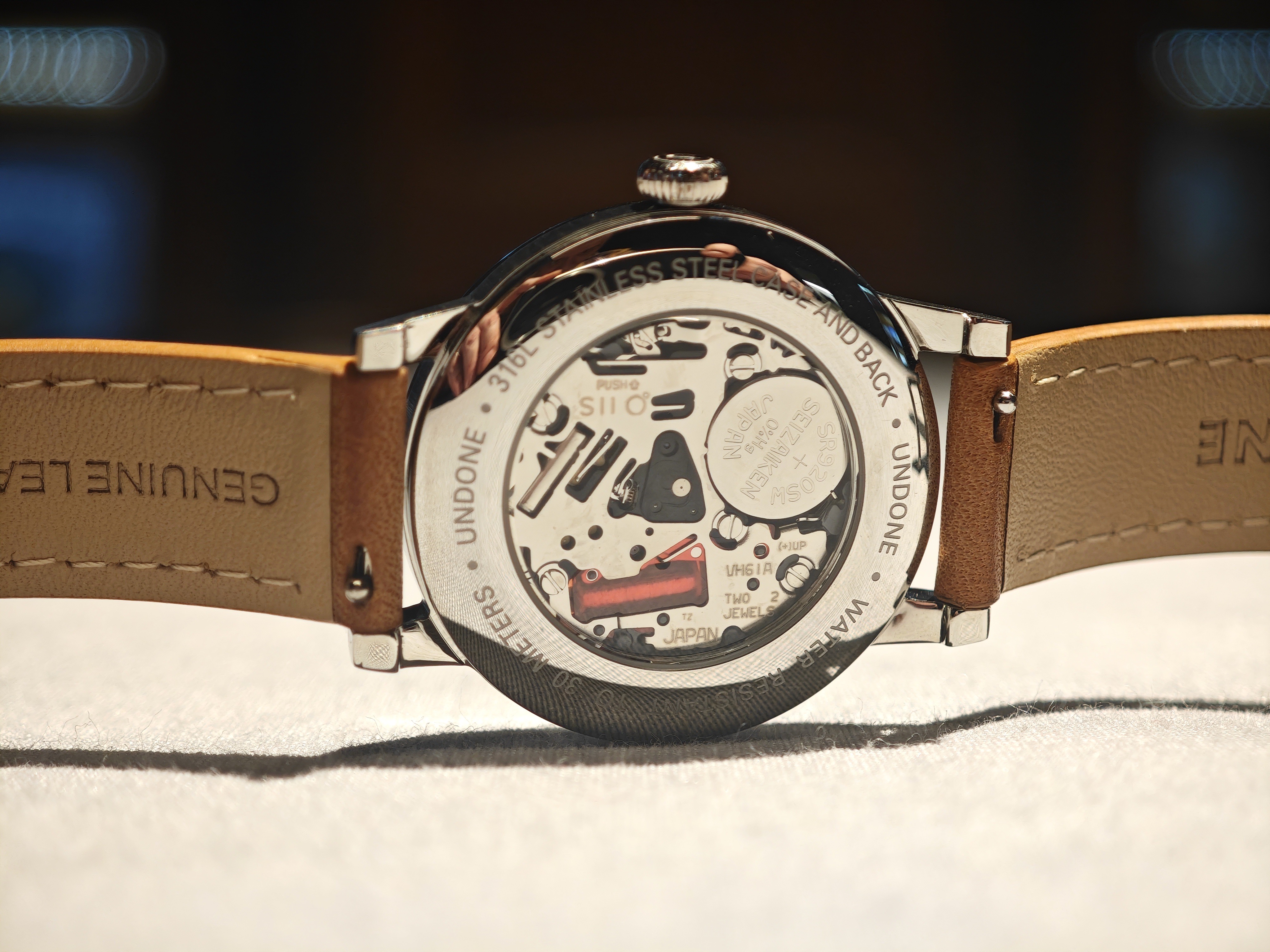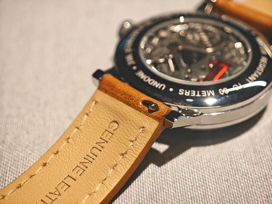 Однако часы все же кварцевые, а плавную секунду им обеспечивает калибр Seiko серии VH. Это одновременно и остроумное, и логичное решение для подобных часов. При этом — компания до последнего штриха сохраняет правильный дух механики, добавляя этим часам прозрачную заднюю крышку! Так что механизм еще и виден.