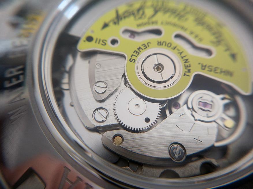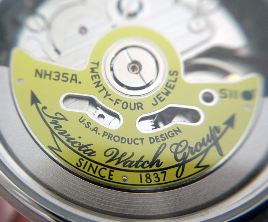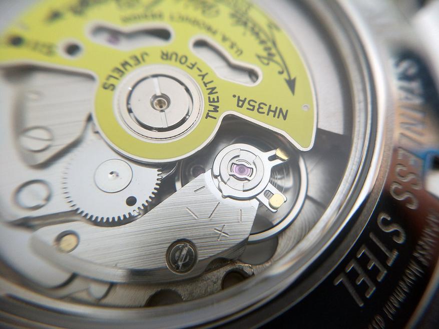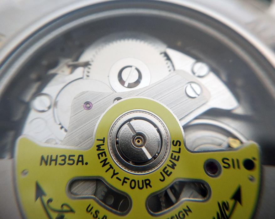 На задней крышке расположено прозрачное окошко, через которое мы можем наблюдать механизм. Это TMI NH35A от корпорации Seiko со следующими характеристиками: автоподзавод, 24 камня, 21600 полуколебаний в час, запас хода 41 час, точность хода: -25/+35 секунд в сутки. Есть стоп-секунда и возможность ручного завода.