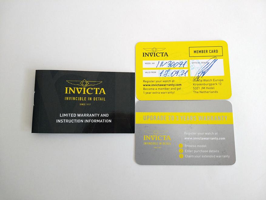 К верхней крышке коробки изнутри прикреплены краткая инструкция к часам на английском языке и две гарантийных карточки. Гарантию предоставляет, как и сам бренд, так и магазин Alltime, как официальный дилер.