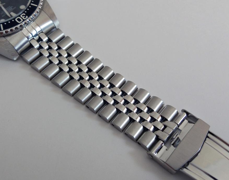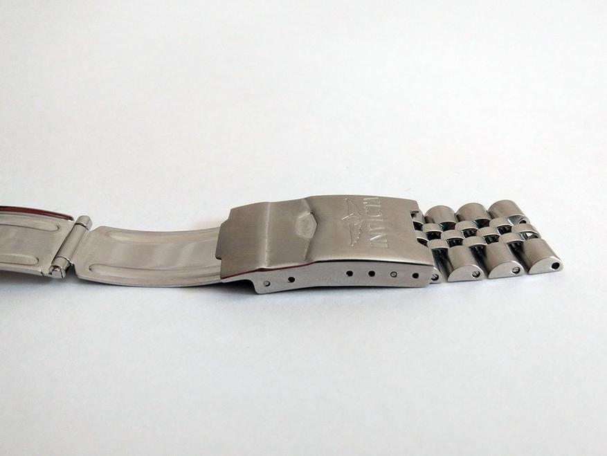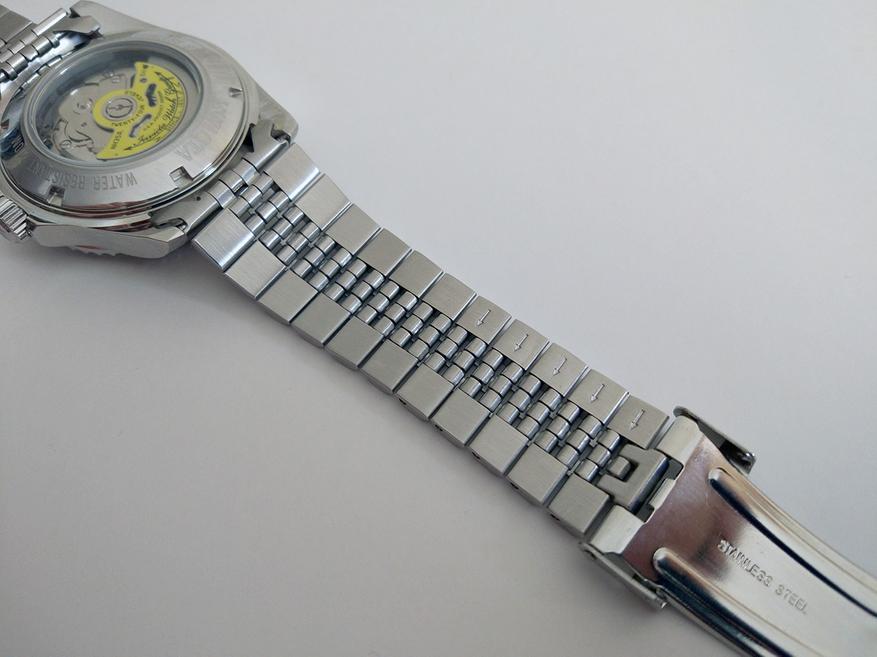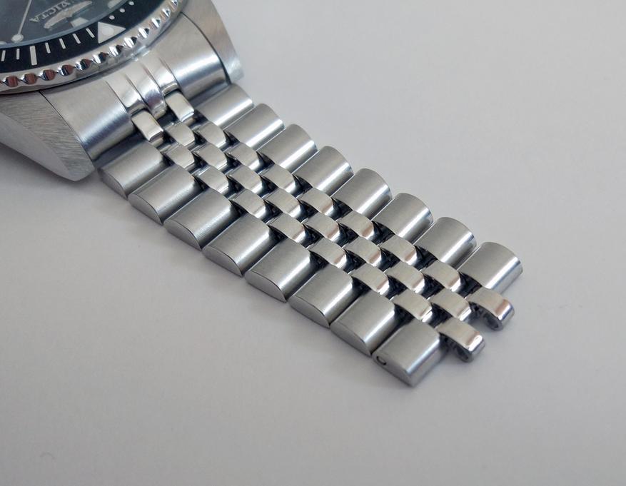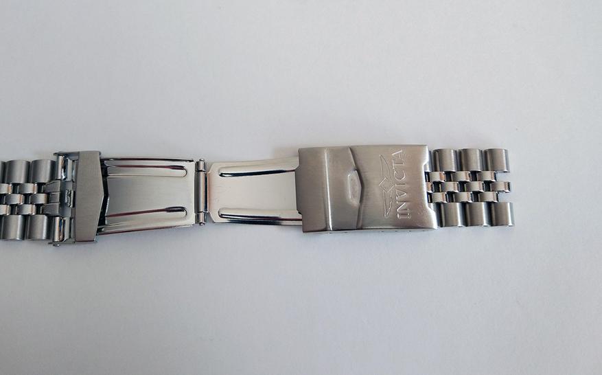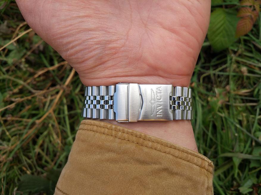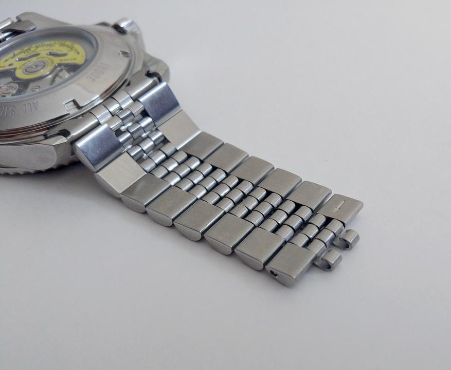 Теперь начнём знакомство с браслетом. В 300-й серии часов Pro Diver компания Invicta заменила так называемый «устричный» браслет, на «юбилейный». «Jubilee» браслет создан в 1945 году в честь юбилея компании Rolex. Он характеризуется тремя узкими полированными звеньями, расположенными между толстыми матовыми боковыми звеньями. Такой браслет является более гибким и лучше облегает запястье, что увеличивает комфорт при ношении.