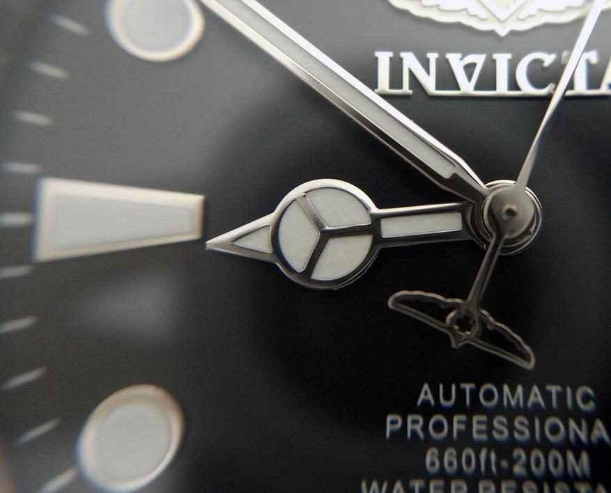 Теперь сравним часы с ближайшими родственниками, работающими на кварцевых механизмах. Золотистые Invicta Pro Diver 90303 с диаметром корпуса 44 мм. Весьма приличное качество изготовления, циферблат и стрелки близки к идеалу. На циферблате действительно яркий люм, один из лучших в категории часов до $100. И Invicta Pro Diver 8932 с корпусом 37.5 мм. Очень похожи на обозреваемые часы, но у этой модели «устричный» браслет, немного другая форма часовых меток, зеленоватый оттенок люма. Заводная головка не завинчивается. Кстати, и у Pro Diver 90303 тоже.