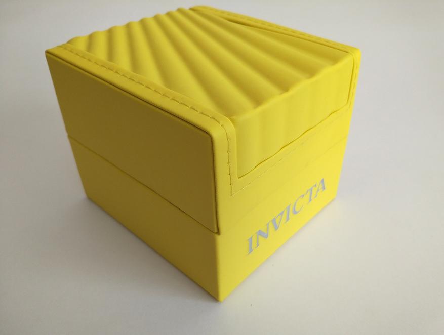 Под упаковочной пленкой обнаружилась белая картонная транспортировочная коробка. А внутри нее фирменная коробка от Invicta обшитая желтым кожзамом.