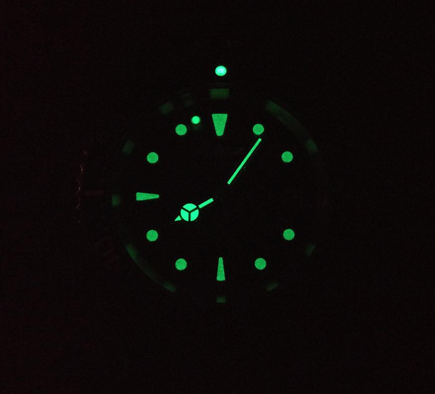 На стрелки и циферблат часов нанесен запатентованный люминофор Tritnite. Я бы не сказал, что он светится особенно ярко и долго, но это норма для часов данной ценовой категории.
