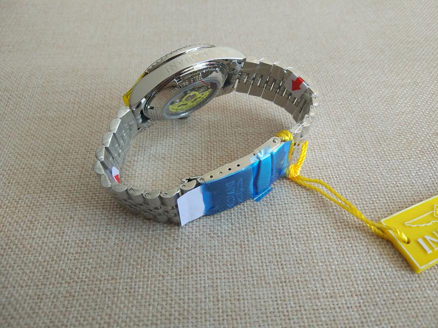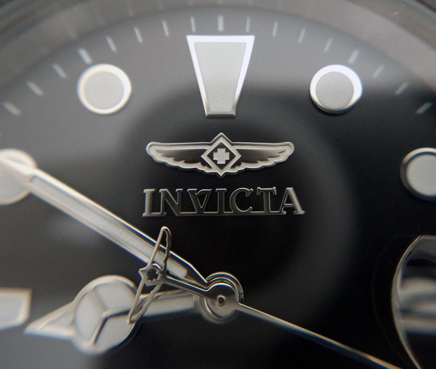 Боковые поверхности корпуса украшены зеркальной полировкой. На правой стороне нанесена надпись Invicta.