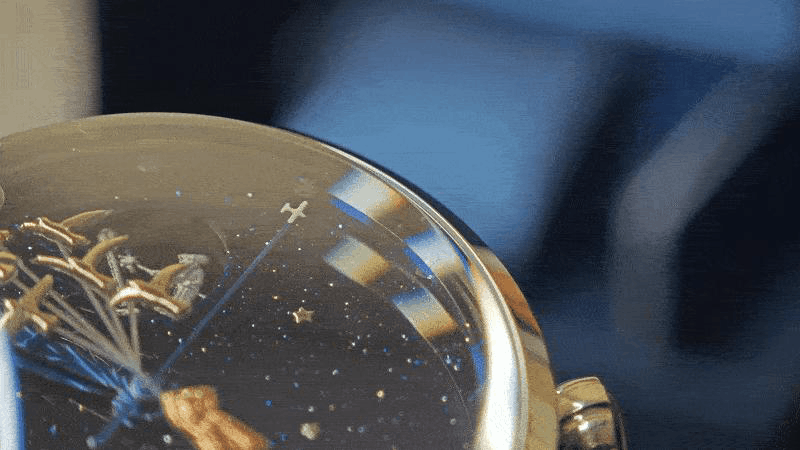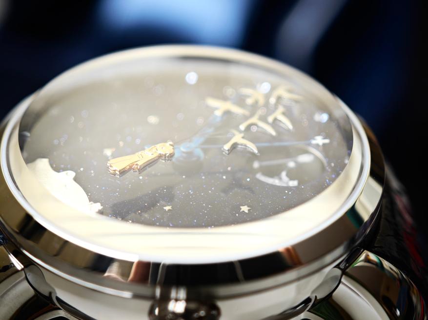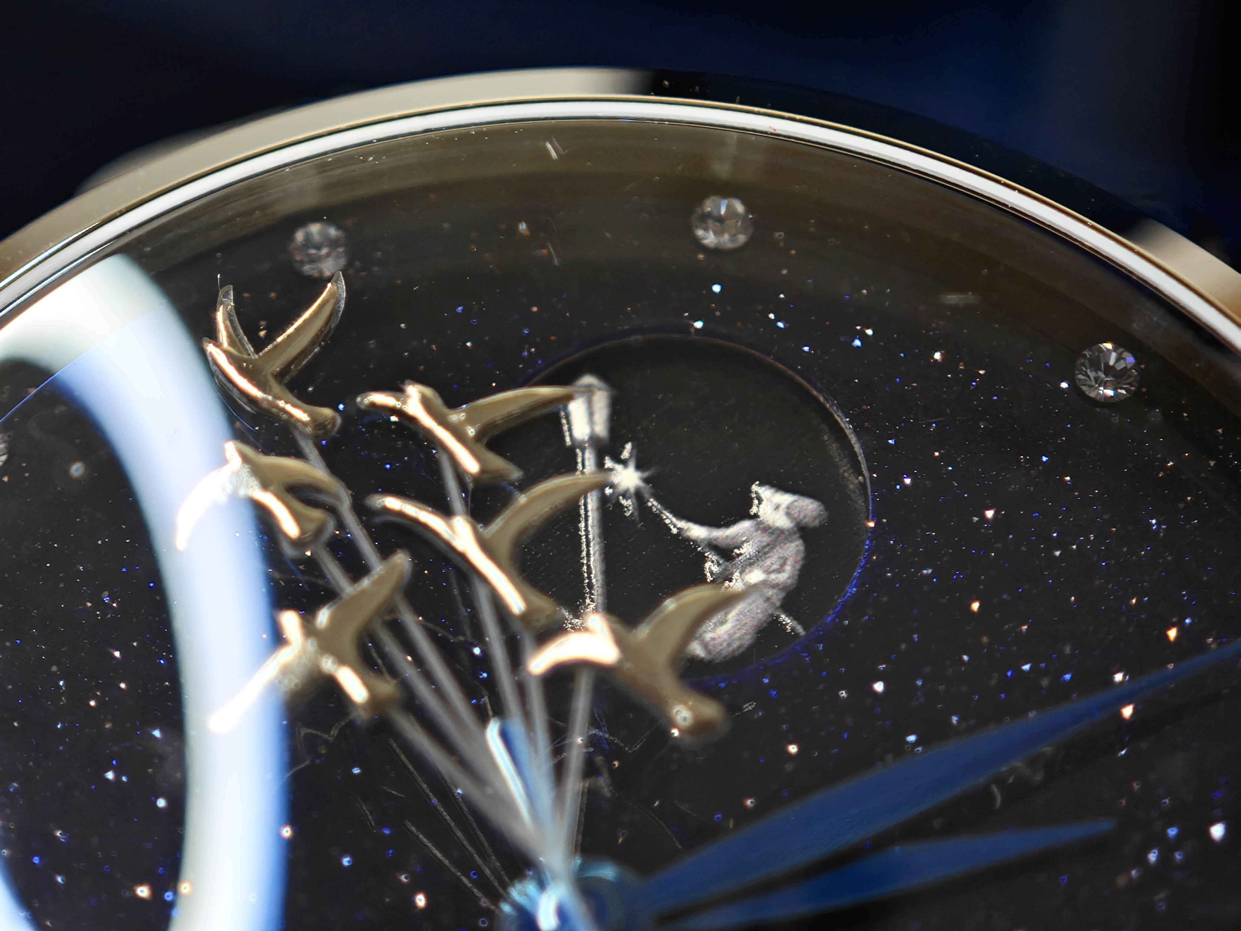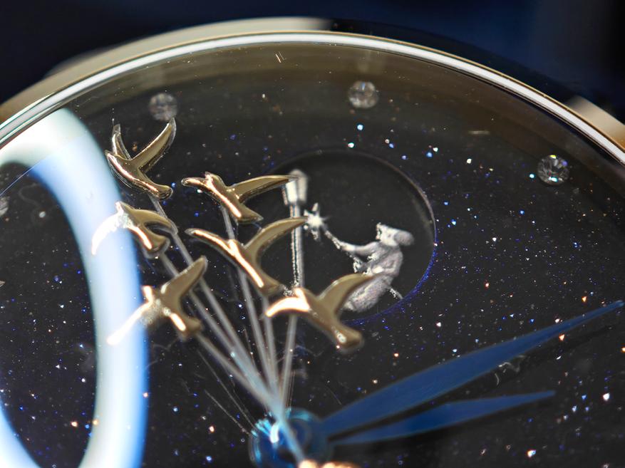 Помимо того, что мы видим здесь фигурки, мы замечаем, что расположены они на фоне звездного неба, роль которого выполняет авантюрин. Яицкий, к слову, одним из первых в России начал использовать авантюриновое стекло в качестве циферблата. Дополнительно он украшен аппликацией звезд, а роль мерцающих меток выполняют кристаллы: