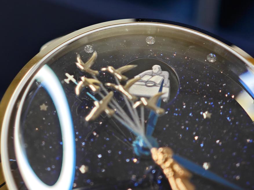 Оммаж автору первоисточника часы имеют с обеих сторон. На циферблате на летчика-писателя намекает секундная стрелка-самолетик: