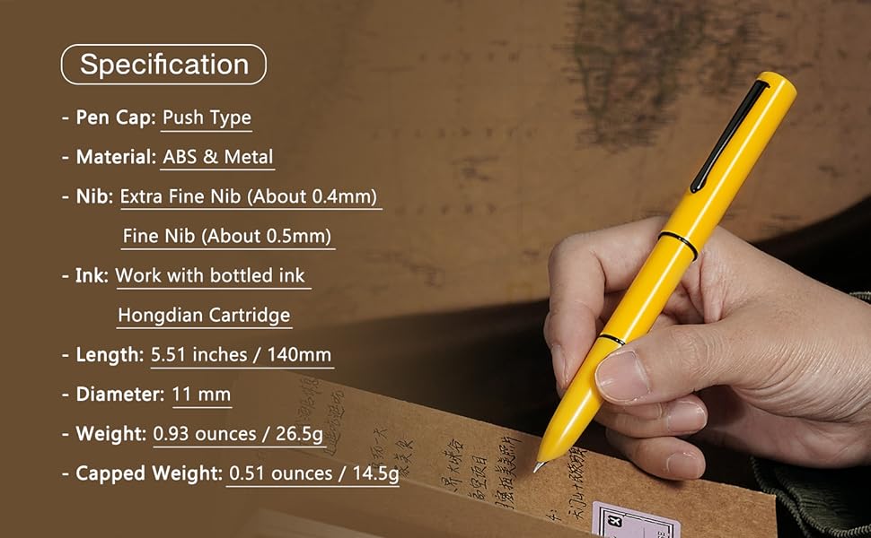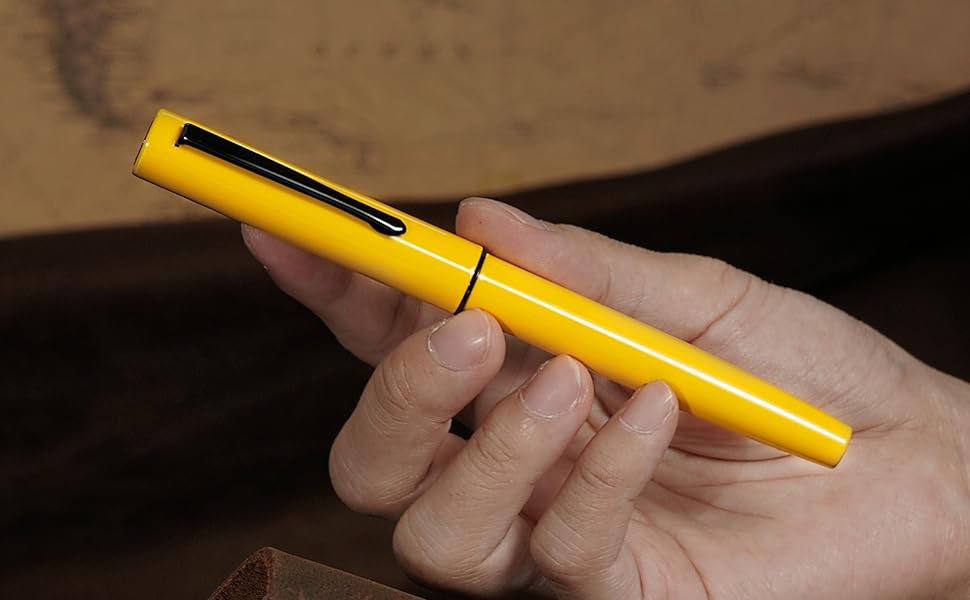 Корпус из АВС пластика с латунью в 5 цветах: черном, ярко красном, желтом, белом и синем. Вес изделия: 26, 5 г., без колпачка уже 14,5 г. Длина — 140 мм, диаметр — 11 мм. Система заправки: конвертер или картридж размера 3,4 мм. На ручках установлены два типа перьев: EF и F.
