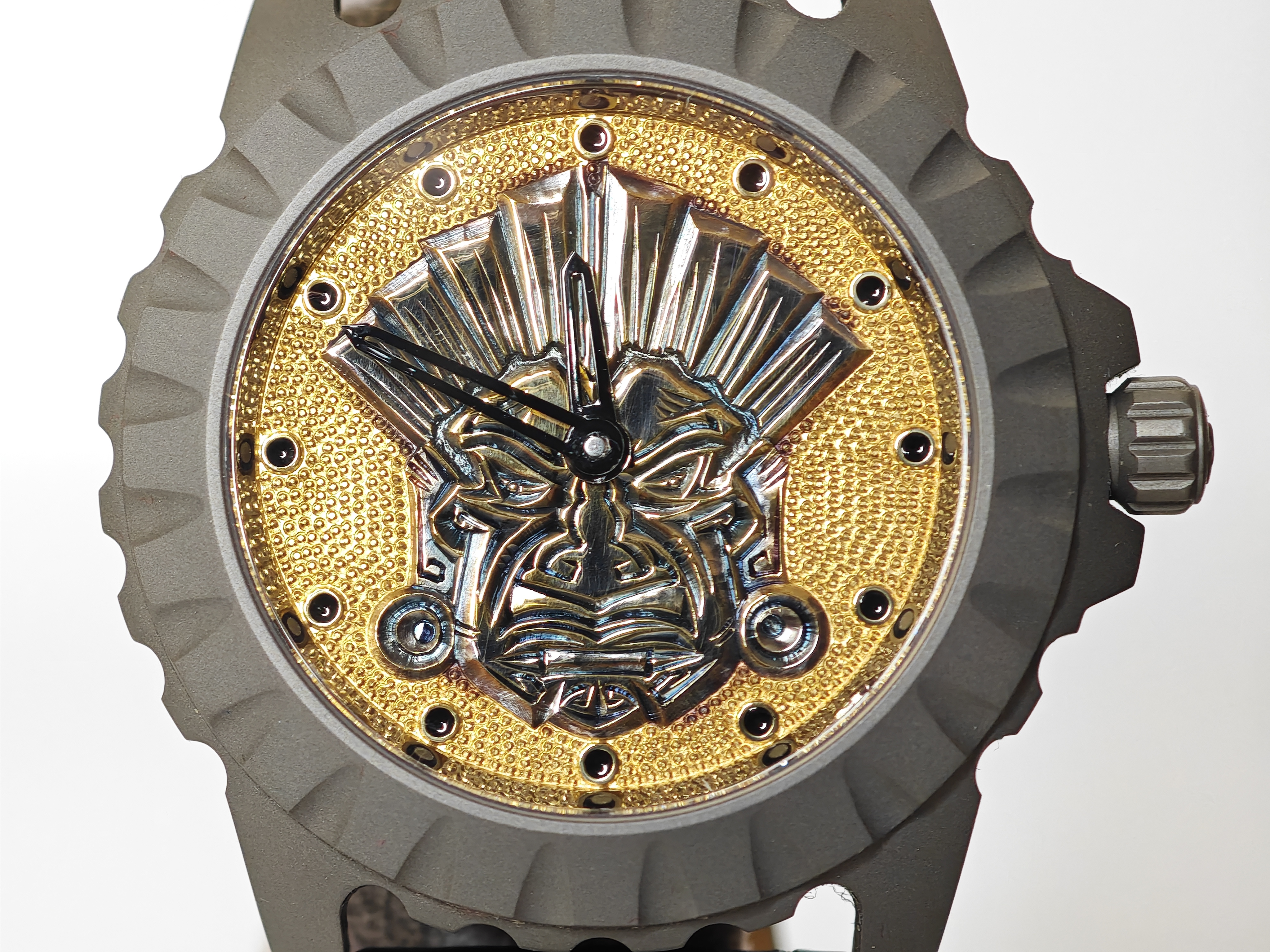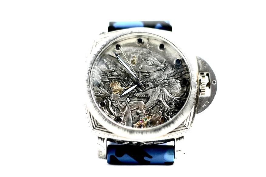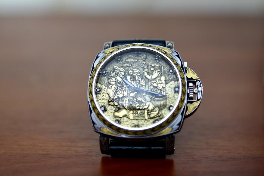 Сейчас перед вами — редкий пример «глухого» циферблата, но для этих часов это даже хорошо, потому что как бы задает тренд сразу нескольким будущим направлениям. Сегодня ателье это и гравировка, и чеканка, и внешняя сторона часов демонстрирует хорошую работу с образом:
