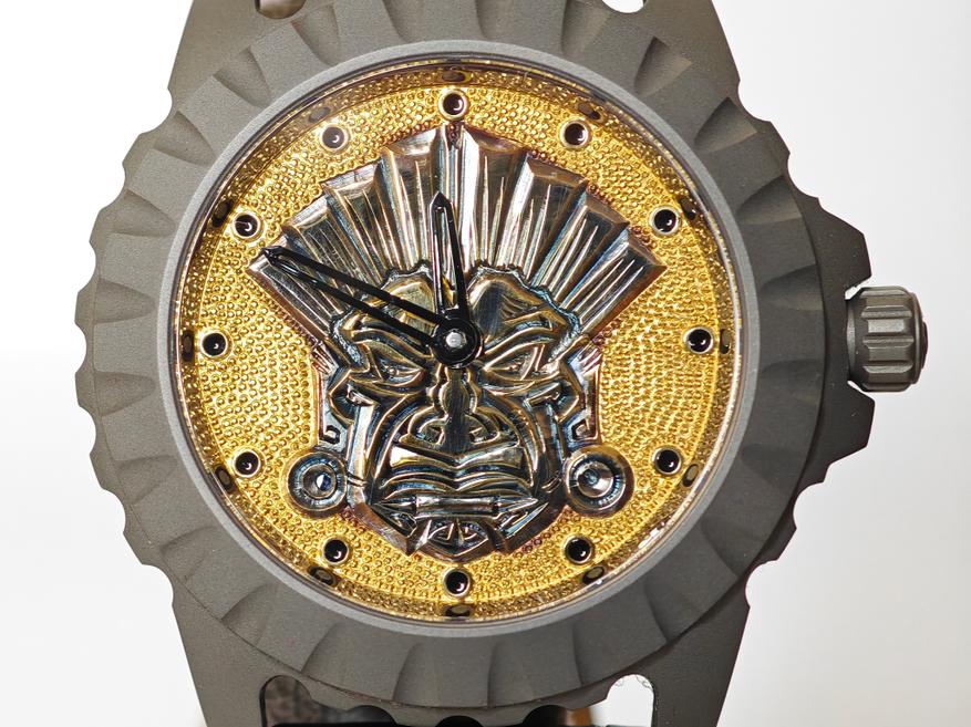 Ацтекская маска входит в небольшой «мексиканский» цикл ранних часов, часть которые выполнены холодной эмалью, часть — таким образом. Пластина циферблата обработана также вручную. Рисунок выразительный, хорошо читаемый: