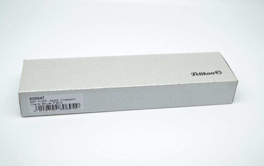 Из всей информации на коробке миниатюрная эмблема пеликана кормящего одинокого птенца, соответственно название бренда — Pelikan, небольшая этикетка со штрих-кодом: 806947 BP K35 Jazz Classic Dark Blue FB/3. На упаковке нет привычного немецкого адреса производителя, нет указания страны производства Германия на каждой поверхности.