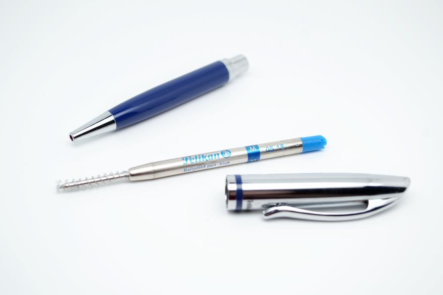 В 2018 году старый немецкий бренд под руководством малайзийских владельцев концерна пошел на поклон к китайским производителям. В итоге получилась недорогая массовая серия шариковых ручек общего и офисного направления. Ручки для подписи и коротких заметок на совещании. Внешне стильно, массивно и с намеком на роскошь в современном дизайне. По каталогу 2022 года выпущено всего 10 цветов отделки. Яркие цвета соседствуют с классическим синим, черным и белым. Мне совершенно случайно попалась на глаза синяя ручка, цвета Dunkelblau, он же Dark Blue. Цвет, как писали в аннотациях, голубой лед с хромом. История покупки проста. Нужно было купить стержень G2, но по цене стержня купил ручку, оснащенную стержнем от Pelikan. По каталогам стержень должен соответствовать стандарту ISO 12757-2 и быть с dokumentenechte Paste (с пастой для работы с документами).