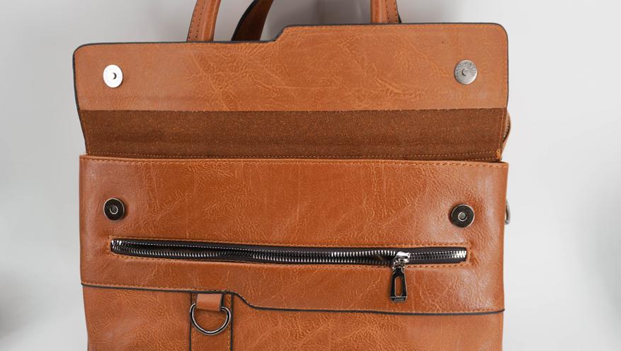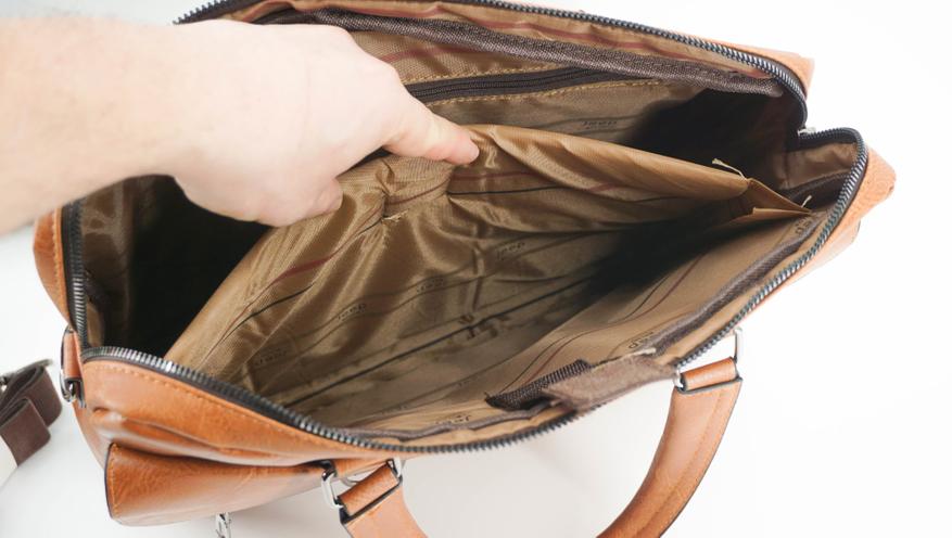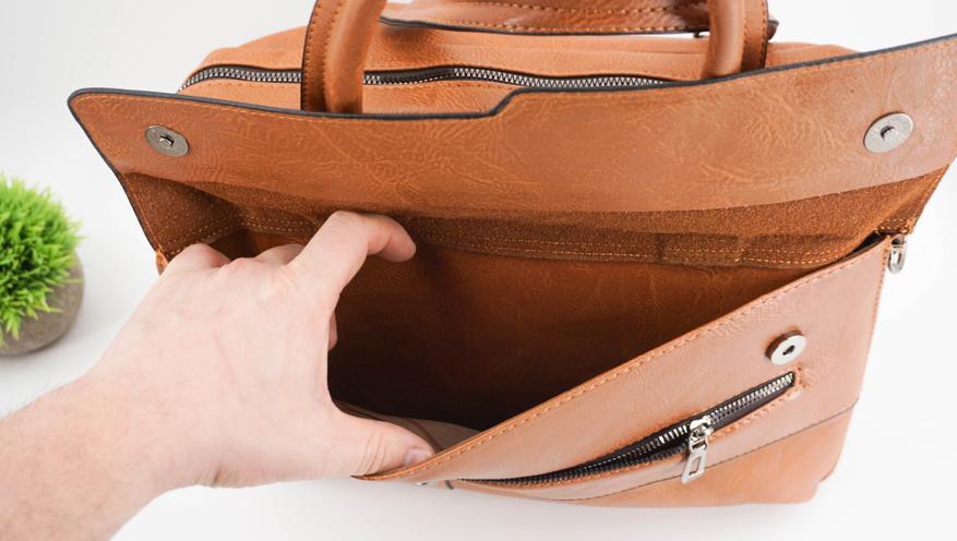 Внутри достаточно просторно: есть два больших отделения, в одно помещается ноутбук, другое чуть меньше, но имеет мягкую отделку. Внутри присутствует подклад, а также имеется дополнительный потайной карман на молнии с внутренней стороны сумки.