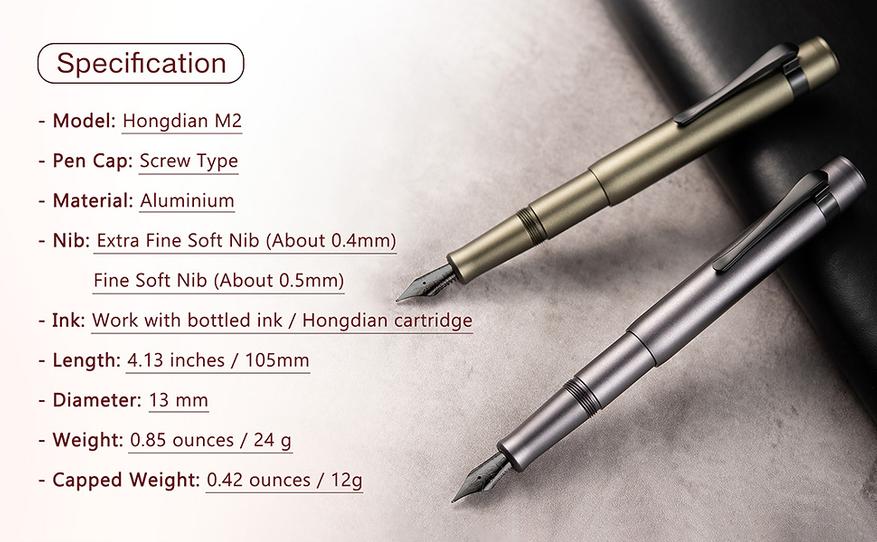 Перьевая ручка Hongdian M2 с 24 г. веса относится к классу EDC изделий карманного, уменьшенного размера. Корпус из алюминиевого сплава. Ручка выпущена в 4 цветах корпуса и снабжена черным пером размера EF и F. Система заправки — конвертер или картридж размера 3,4 мм. В ручке можно использовать короткие картриджи Parker.