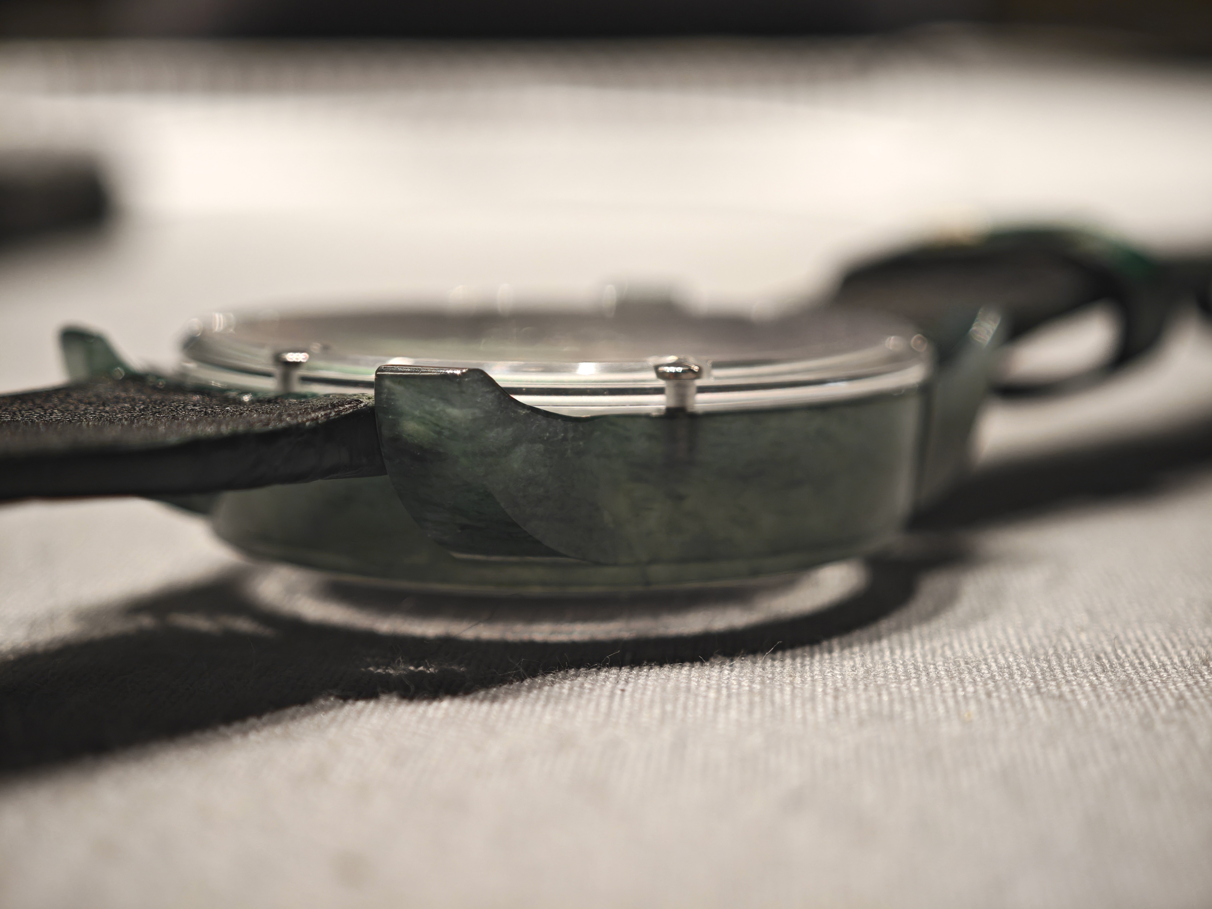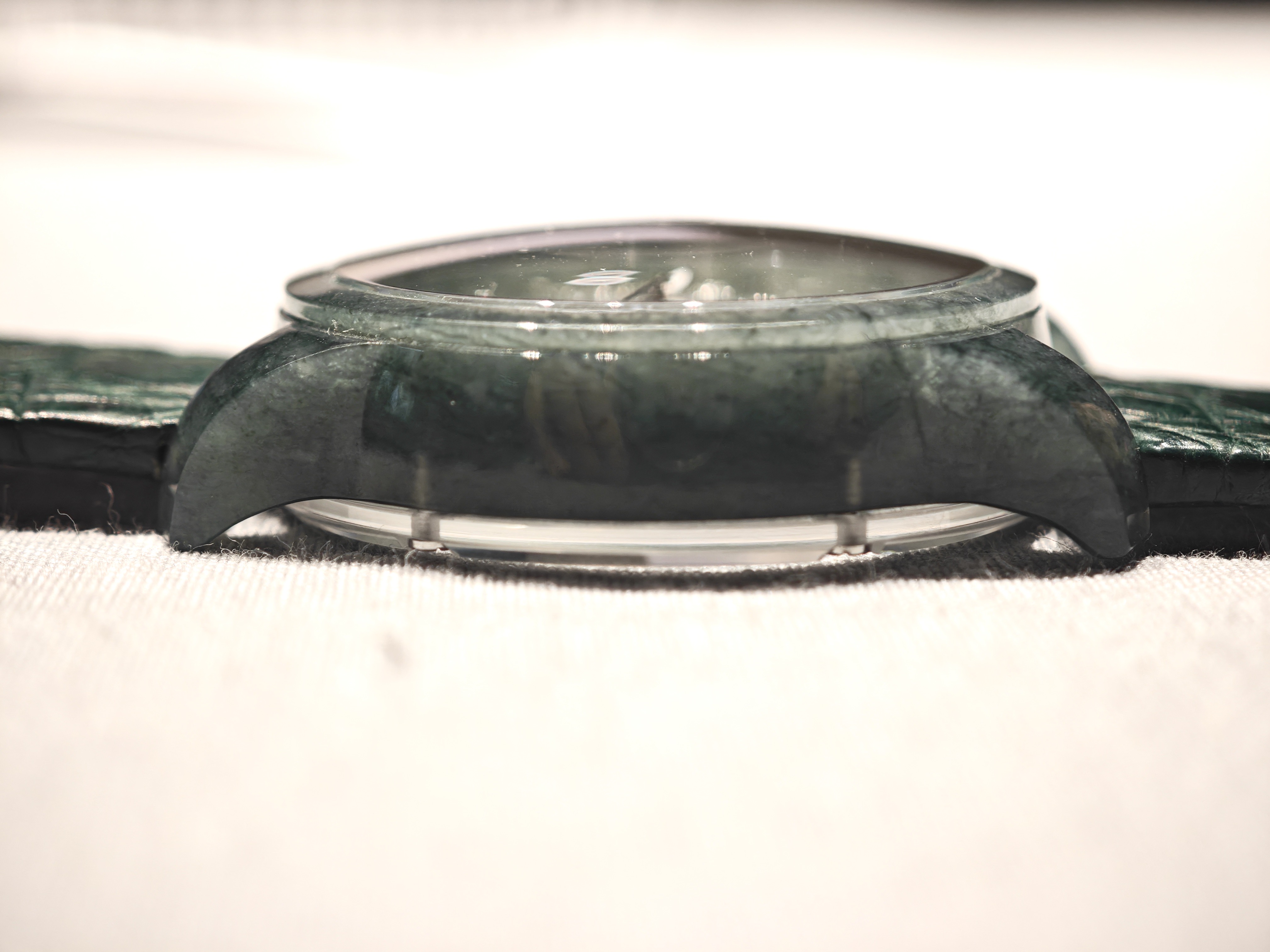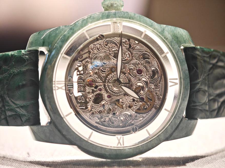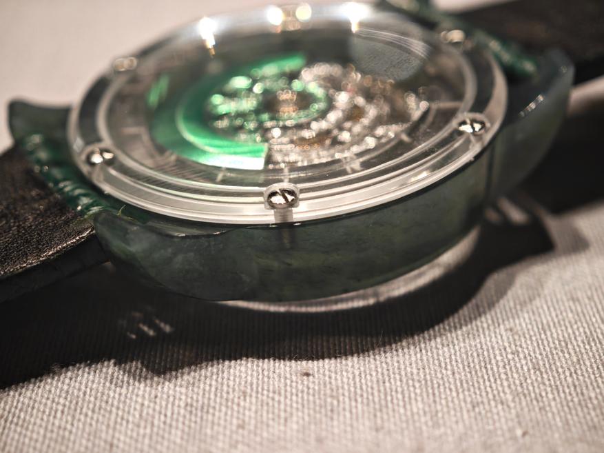 Особый интерес в этих часах представляет корпус, выполненный из натурального нефрита. Видно, что он выточен из цельного куска, вплоть до ушек! Сохранен и символический безель.