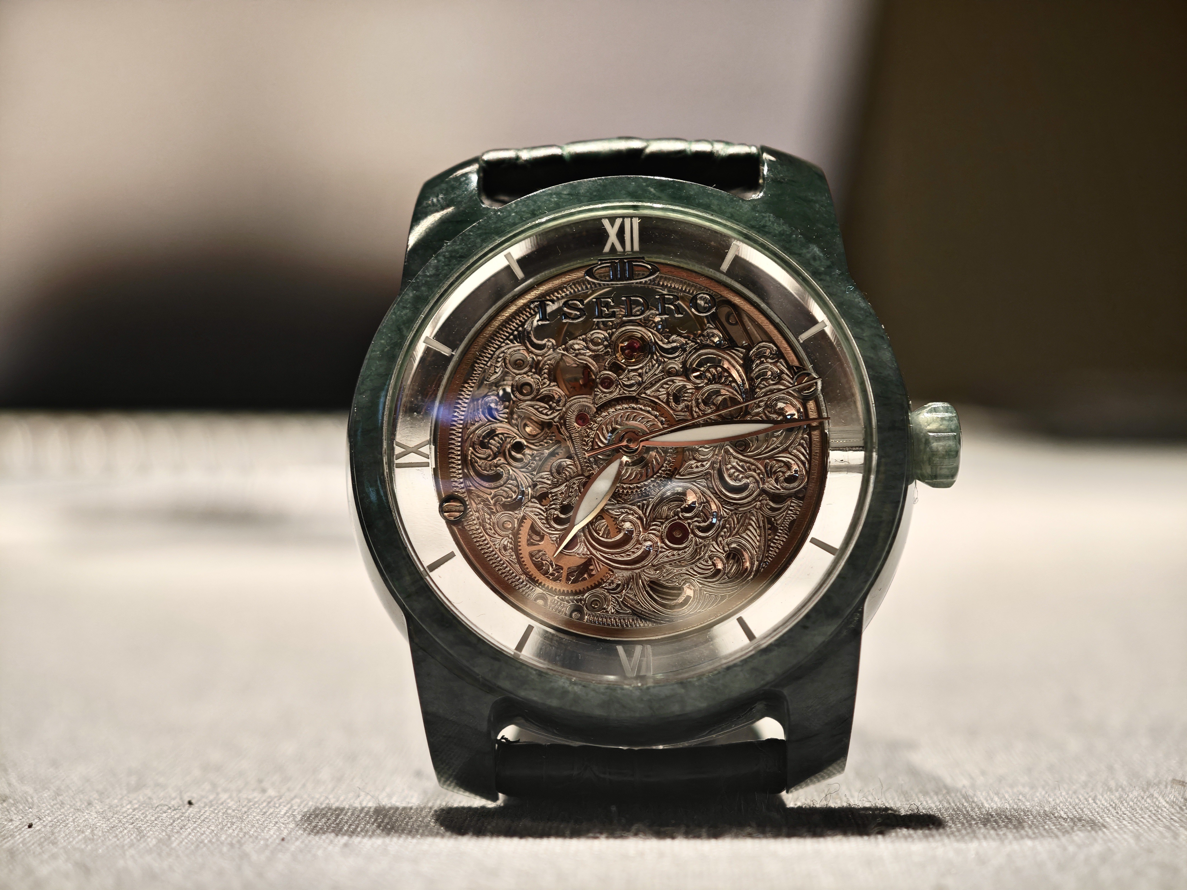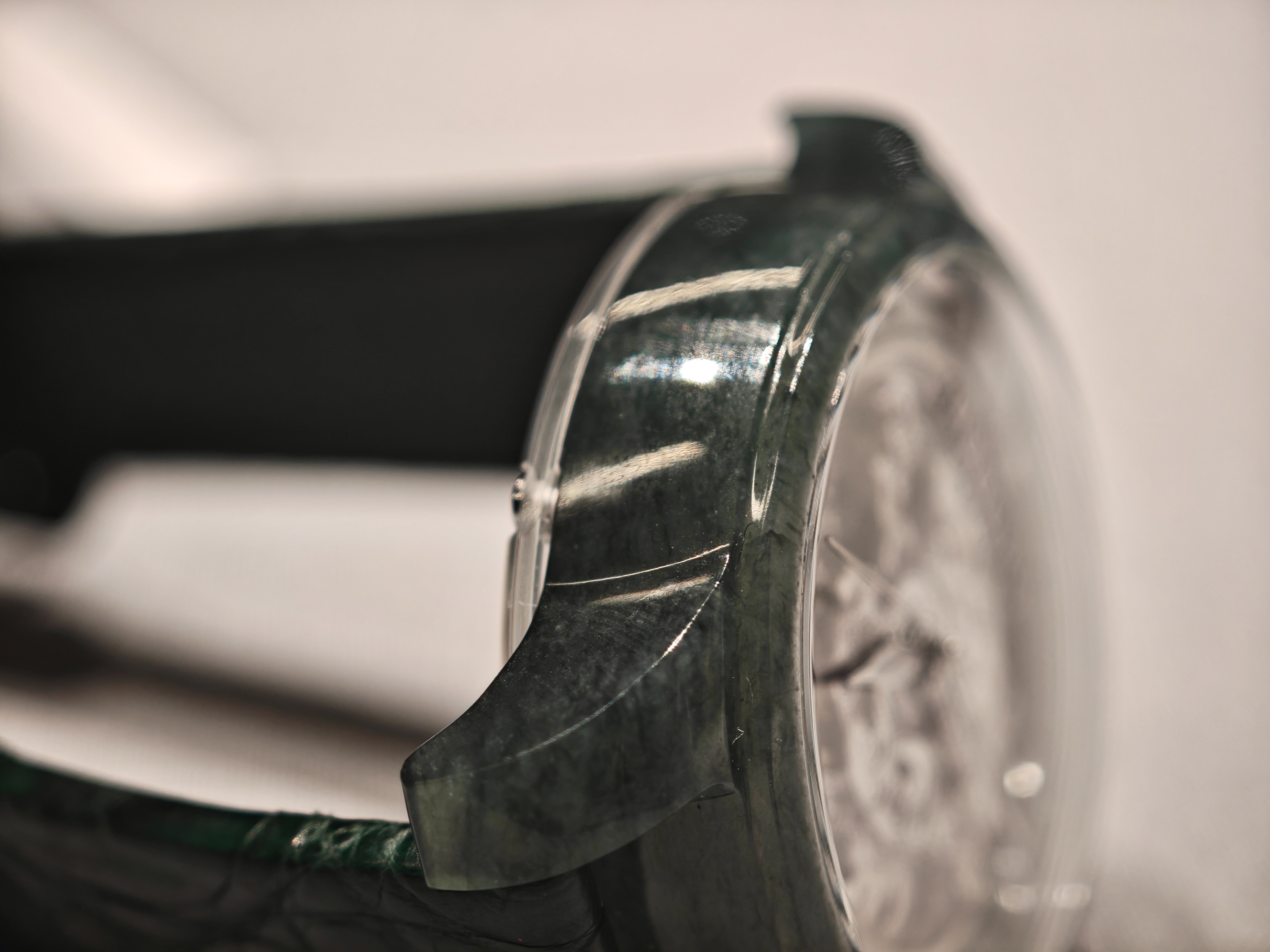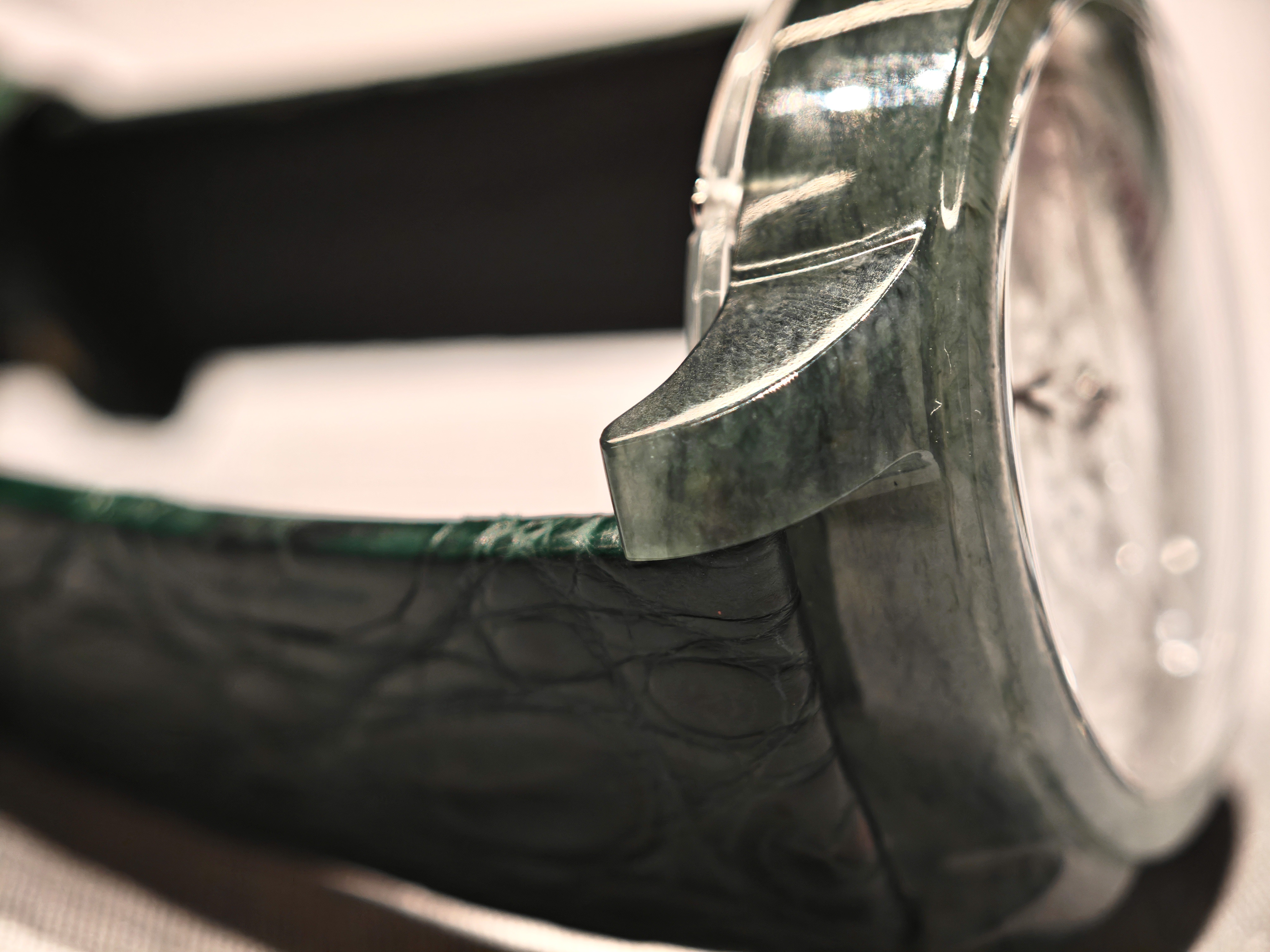 Особый интерес в этих часах представляет корпус, выполненный из натурального нефрита. Видно, что он выточен из цельного куска, вплоть до ушек! Сохранен и символический безель.