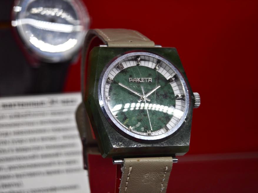 В заголовке часы намеренно локализованы, «первые российские», потому что среди часов СССР, строго говоря, нефритовый корпус был. Сейчас эту «Ракету» можно увидеть в Музее Времени и Часов.