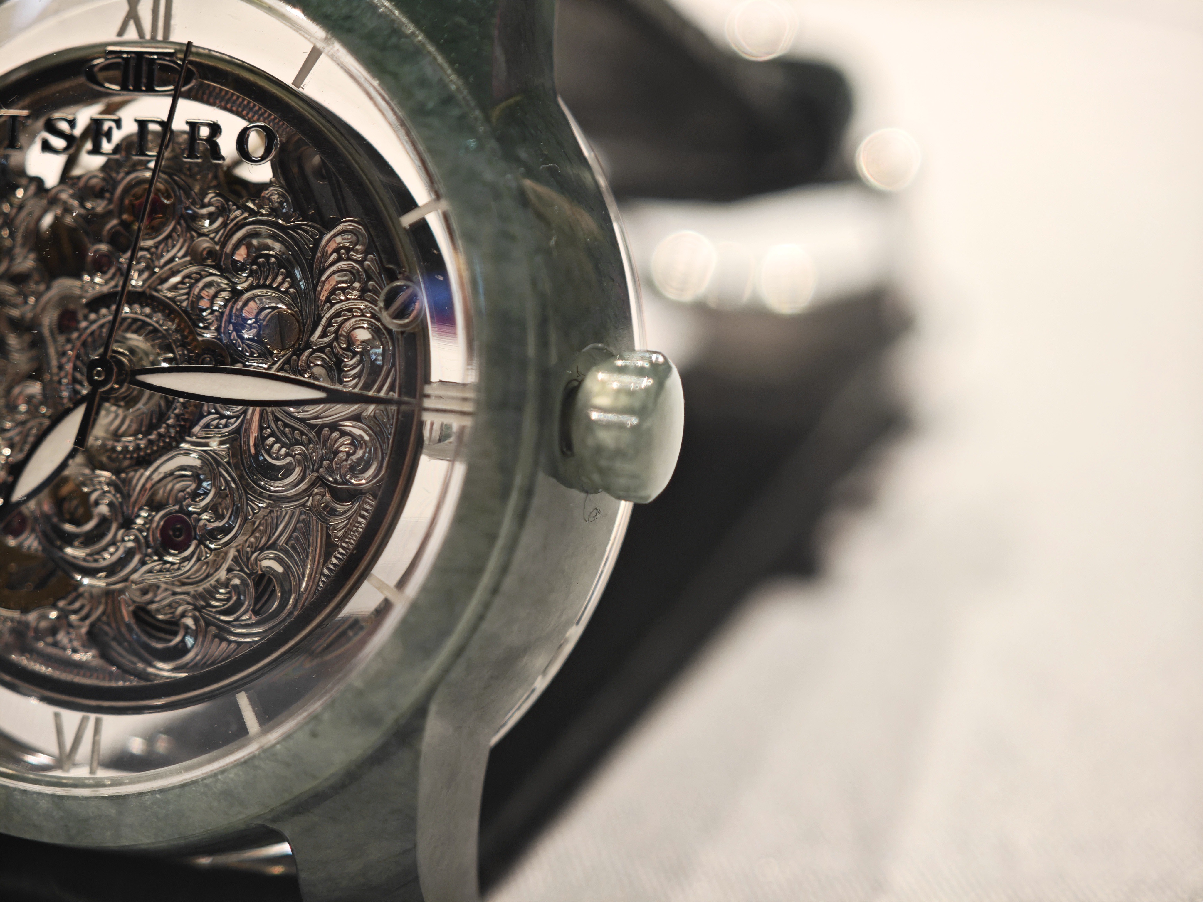Стиль часов справедливо отнести к скелетону: наша модель не имеет циферблата. Роль декора здесь полностью забирает на себя швейцарский калибр 2824, украшенный вручную цветочным узором.