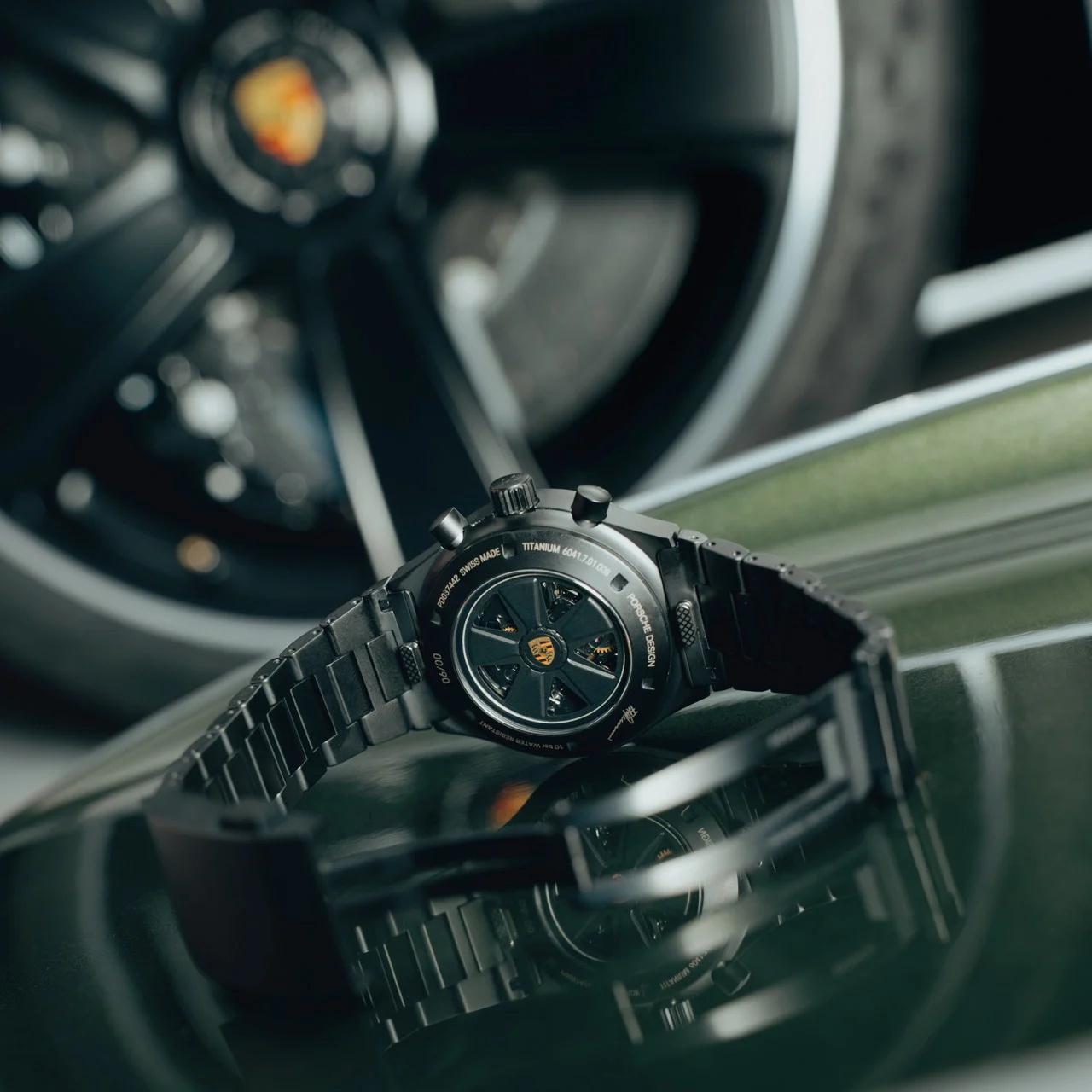 Ротор механизма повторяет дизайн колеса автомобиля 911 GT3 90 F. A. Sonderwunsch с центральным гербом и видимыми спицами. На задней крышке нанесена индивидуальная нумерация от 1 до 90 и подпись Ф. А. Порше. В комплект входят титановый браслет с черным покрытием и кожаный ремешок Truffle Brown с контрастной строчкой, соответствующий отделке салона юбилейного GT3. Предусмотрена система быстрой замены ремешков.