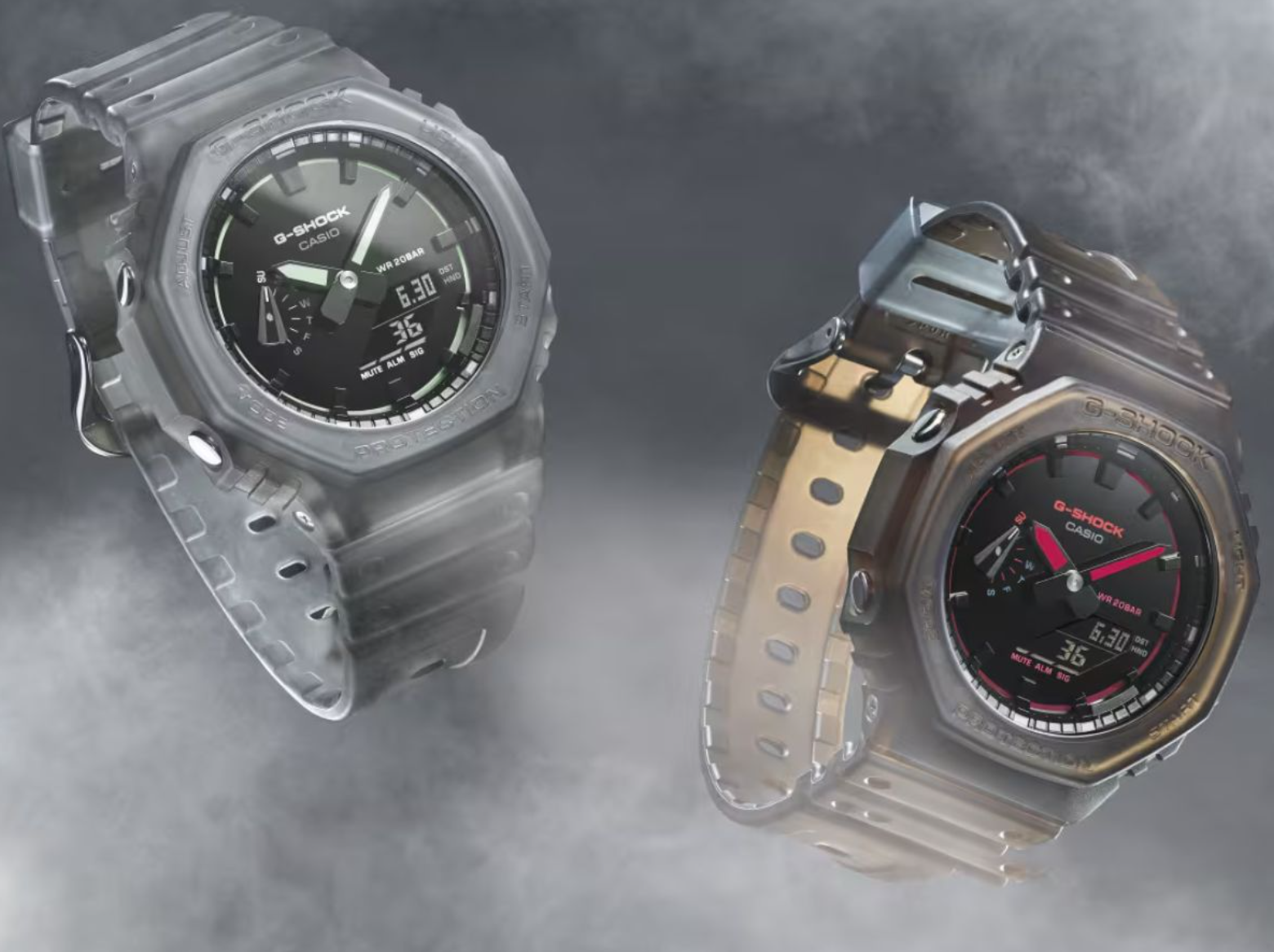 Каждая модель получила прозрачный безель, а корпус и ремешок выполнены из полупрозрачной дымчатой смолы. Такой материал придает часам необычный визуальный эффект и делает их отличительными от стандартных моделей G-Shock. Часы поддерживают функции мирового времени, секундомер, таймер обратного отсчета и несколько будильников. Для удобного чтения информации предусмотрена двойная светодиодная подсветка, освещающая и цифровые, и аналоговые элементы. Также есть индикатор дня недели, а корпус способен выдерживать погружение в воду благодаря водозащите 20 БАР.