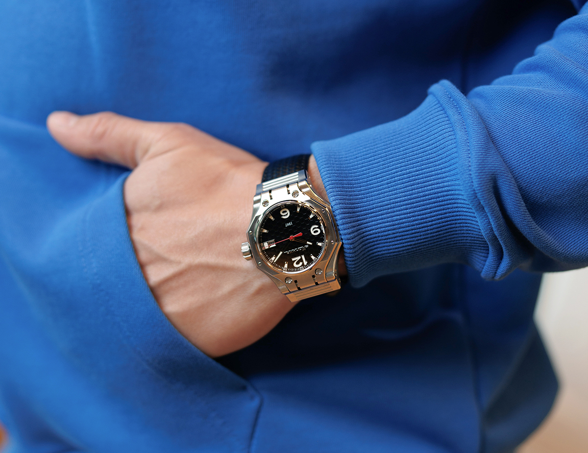 В новых Hyron изменили практически все: теперь это спортивные часы в модном многоугольном корпусе, с интегрированным ремешком, а защита от воды понизилась до 100-метрового уровня. Механика теперь — с автоподзаводом (Miyota 8215).