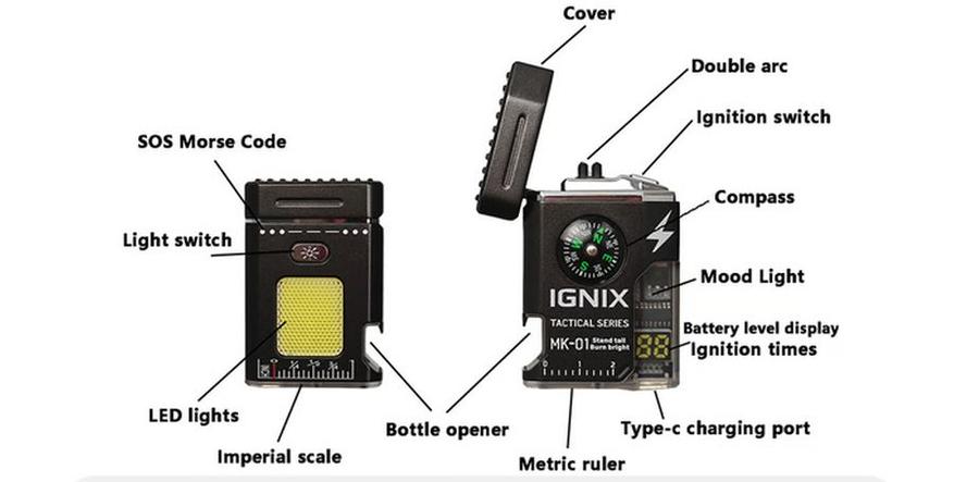 Попытки добавить к обычной зажигалке полезных дополнений ведутся давно, ведь это тот предмет который постоянно пол рукой у многих людей. Стартап из Гонконга Gavin представил EDC-зажигалку с плазменно-дуговой системой поджига с двумя электродами (температура дуги 2000°C). Такое решение не требует заправки газом, а уровень заряда АКБ можно увидеть на дисплее с подсветкой. Из полезных дополнений в IGNIX MK-01 интегрирован магнитный компас, COB фонарь (до 150 люмен, 3 режима), линейка и открывалка для бутылок.