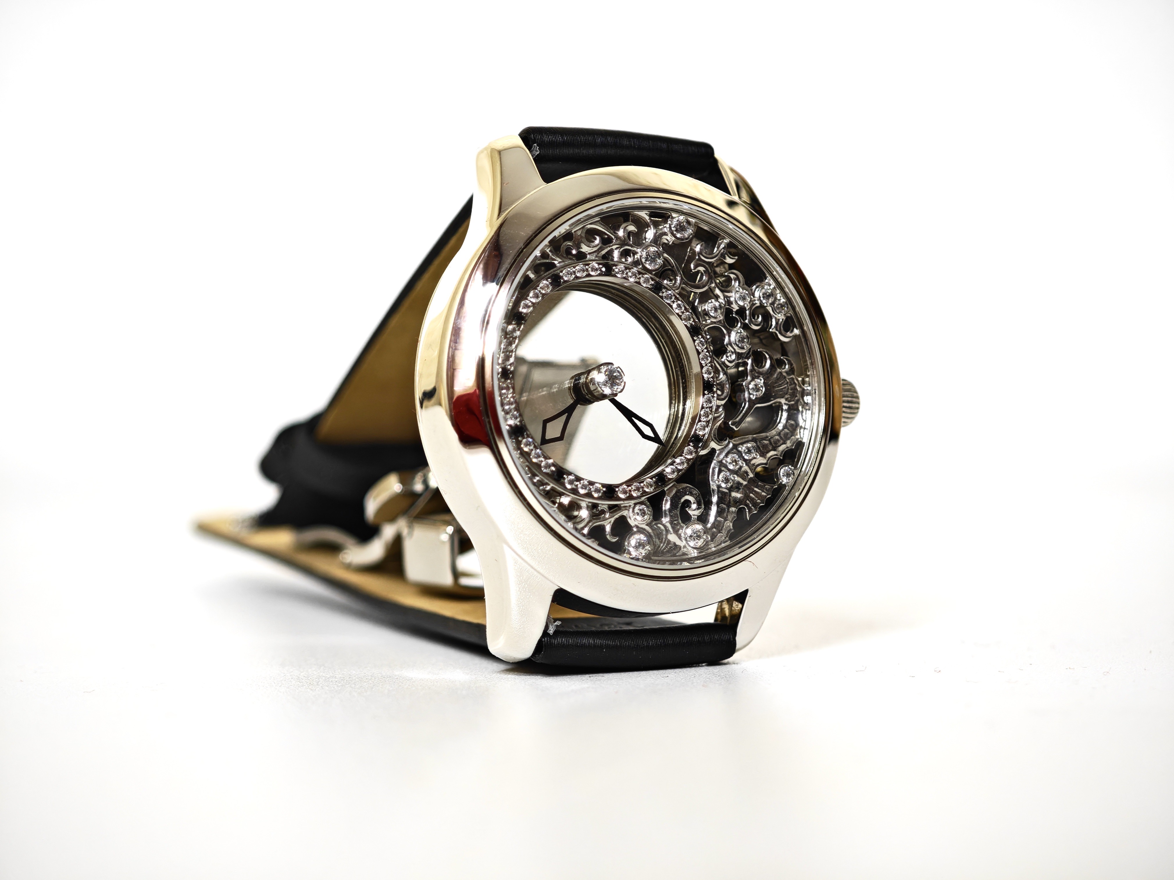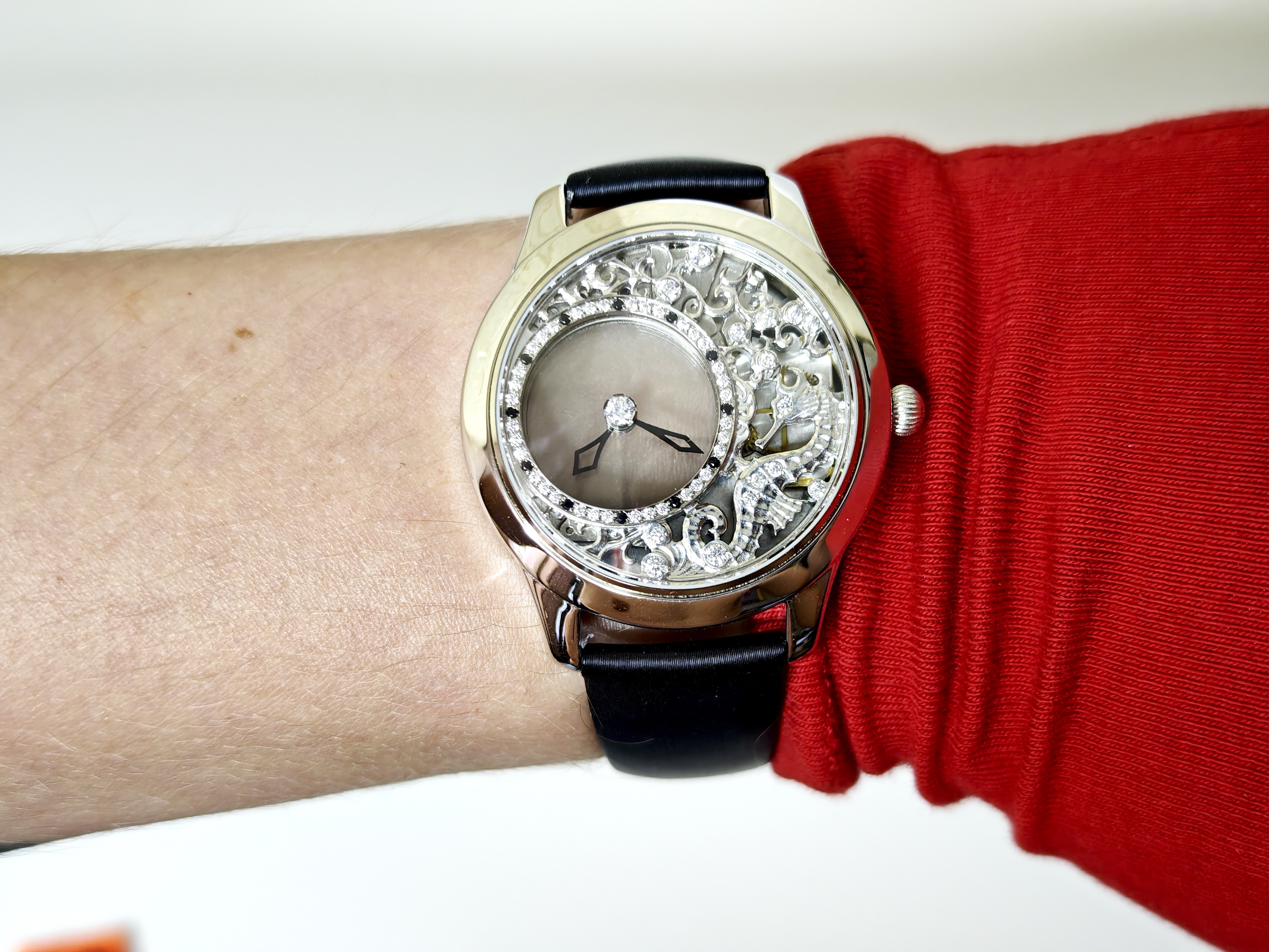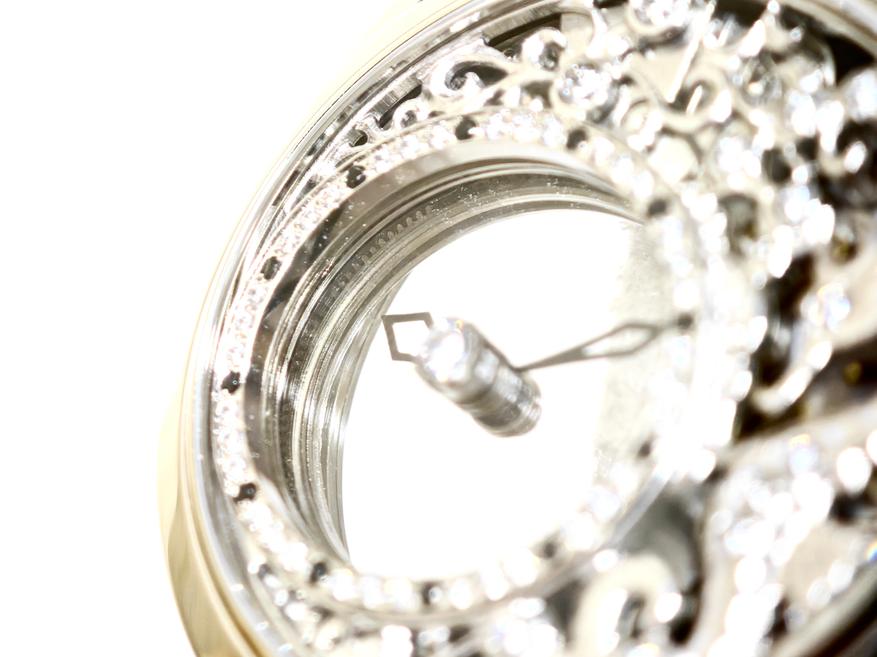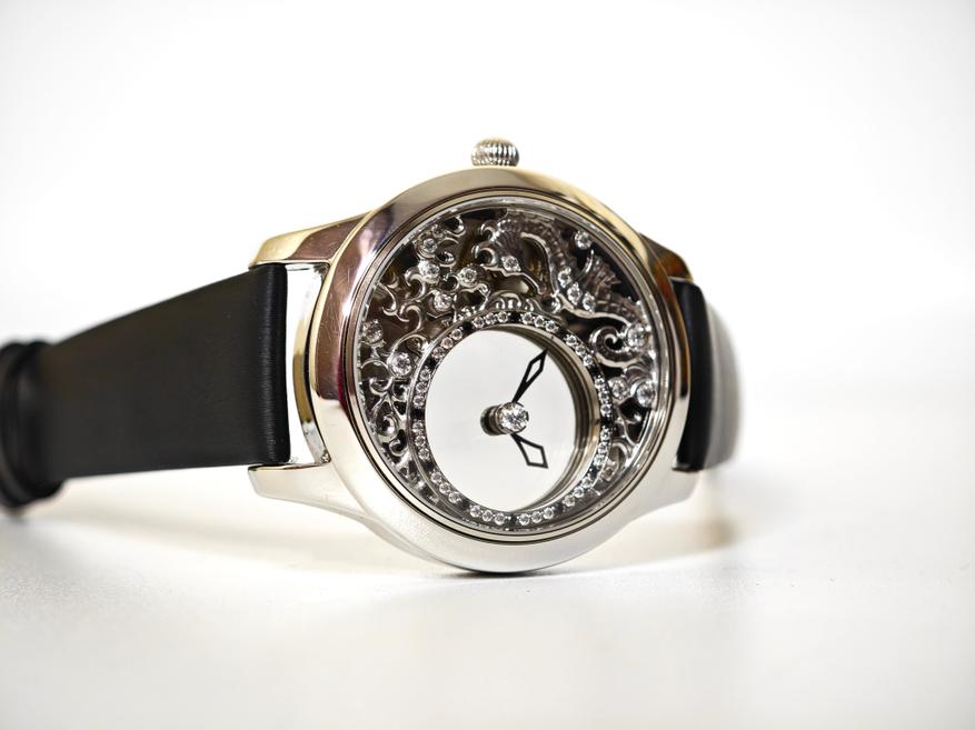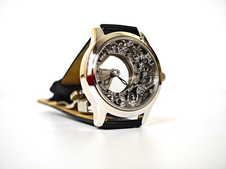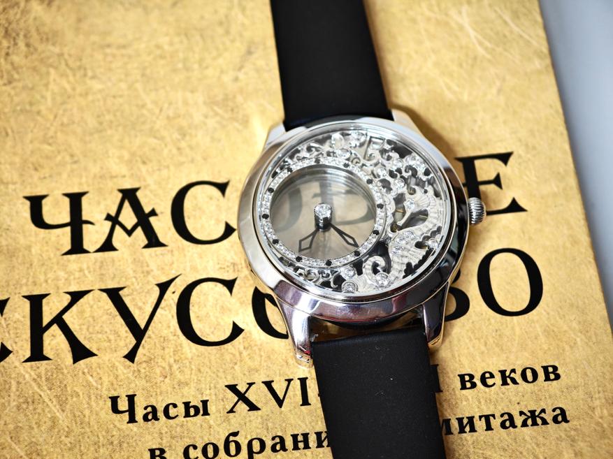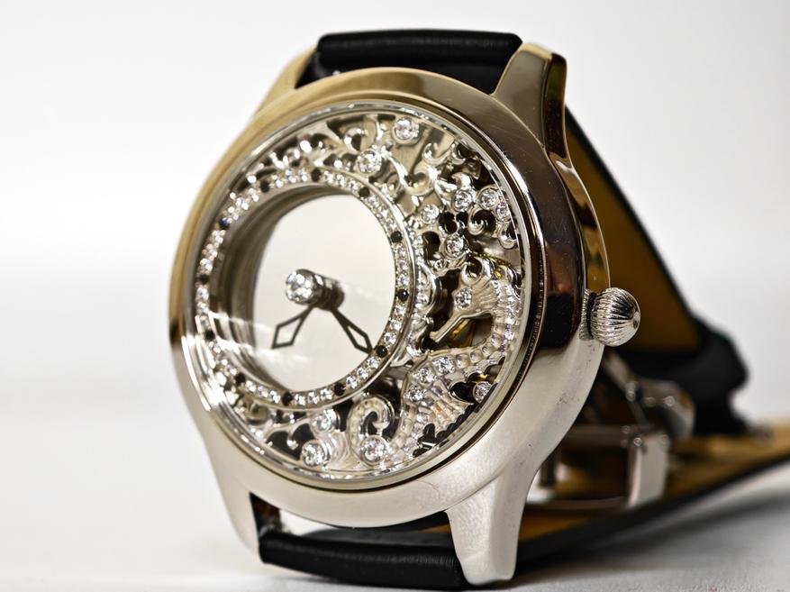 У этих часов настолько прозрачный циферблат, что его «просто не существует». Казалось бы, мы видели подобное в скелетонах, но магия этой модели в том, что стрелки парят здесь как бы сами по себе: они не связаны с механизмом, они не связаны с заводной головкой… При этом, если вы будете эту заводную головку крутить, то стрелки будут послушно ей повиноваться.