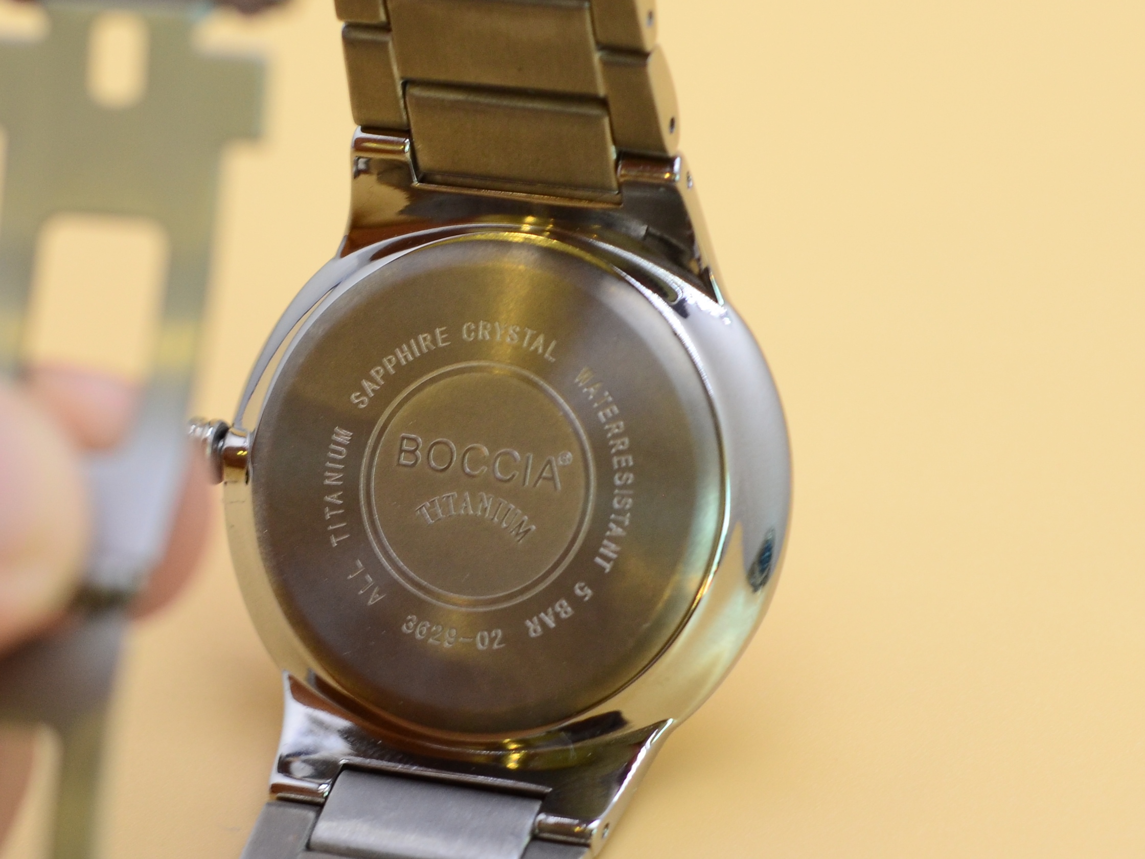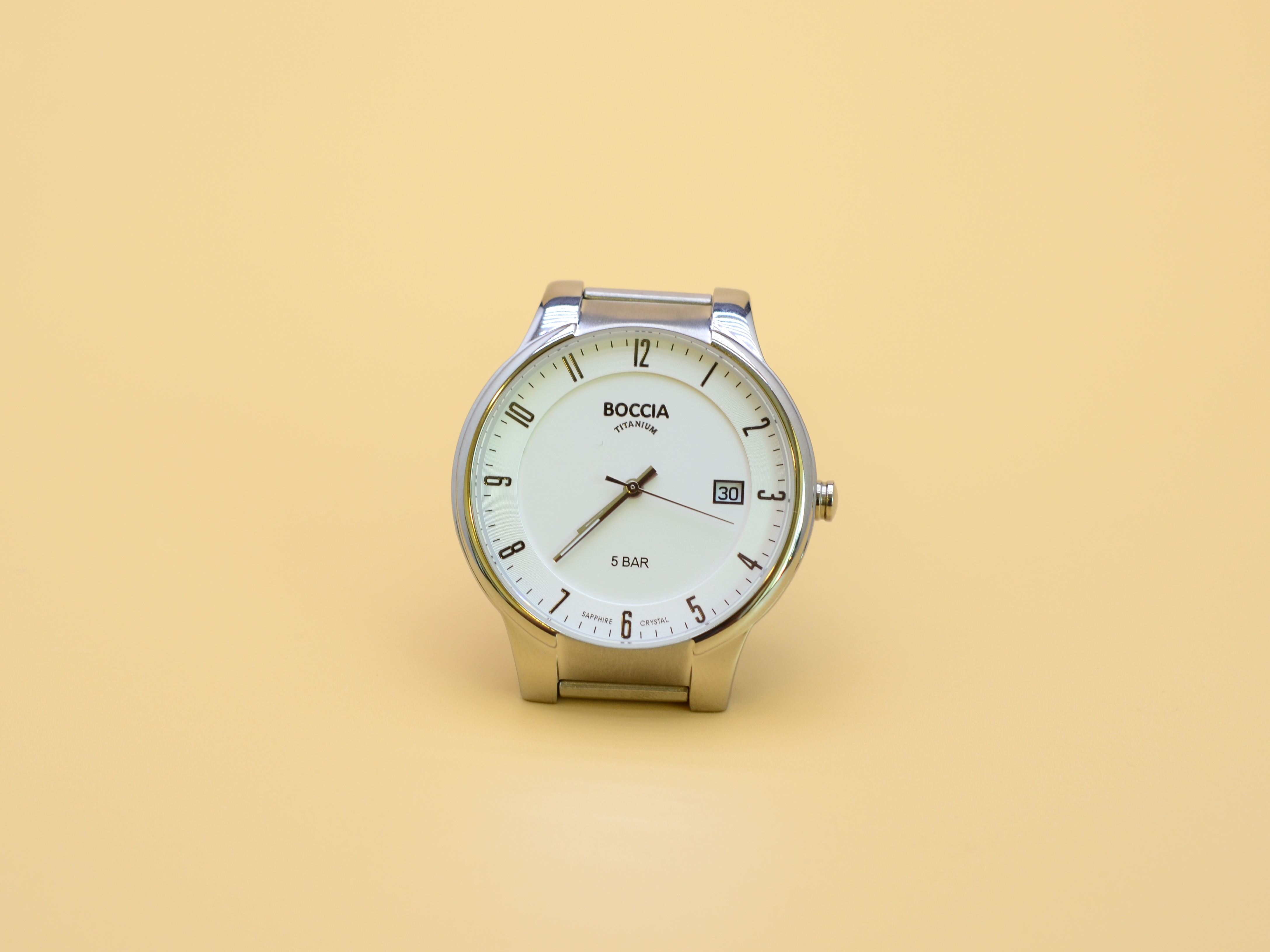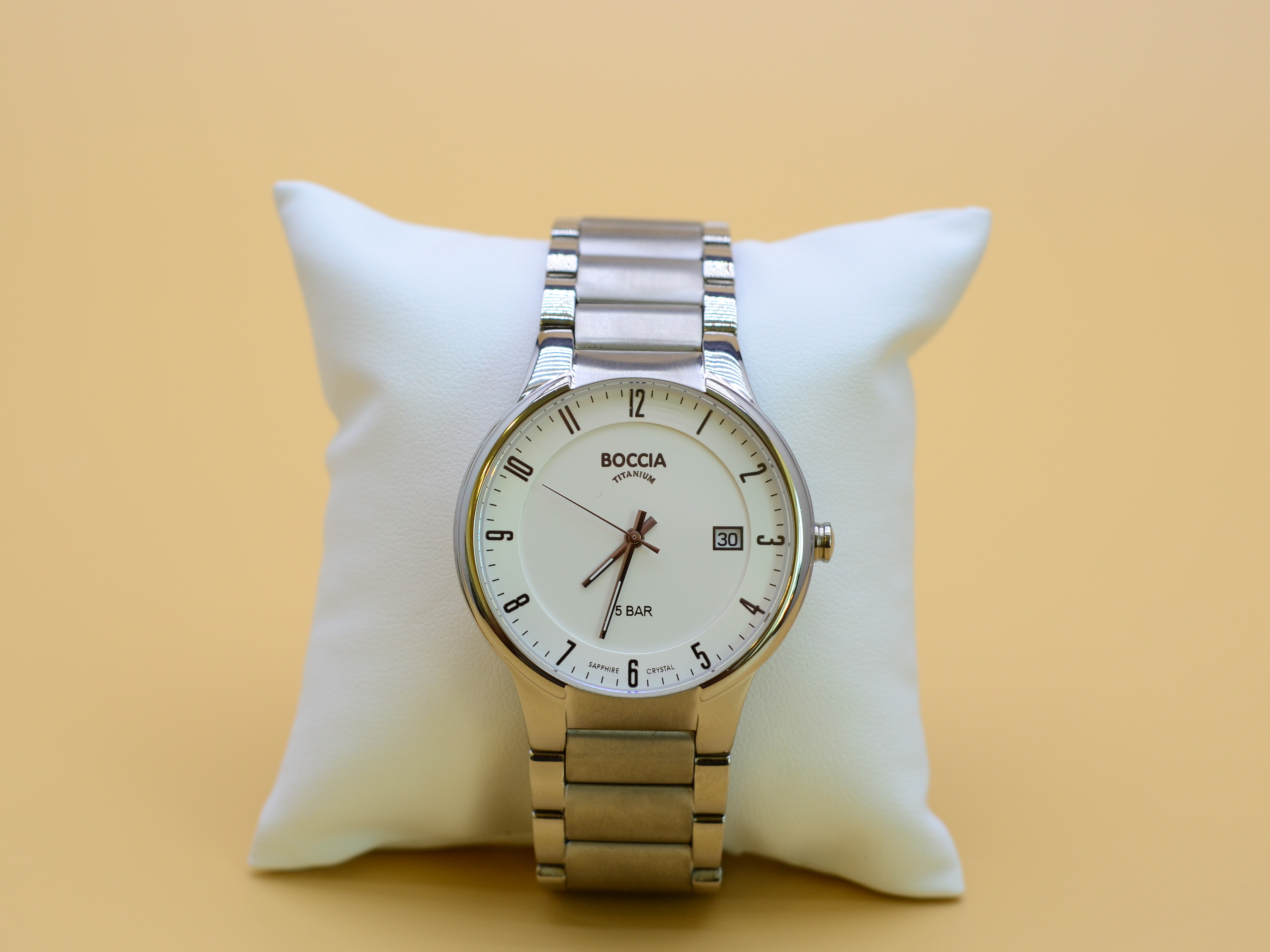 Циферблат часов не перегружен лишними механизмами, этим часы меня и привлекли. Белый циферблат с цифрами того же цвета что и корпус с браслетом и минимальное окошко для даты — классика во всей красе. На циферблате красуется логотип BOCCIA и информация о том, что стекло тут используется сапфировое, а корпус выполнен из титана. Так же тут есть надпись 5BAR, что говорит о том, что часы можно погружать в воду.