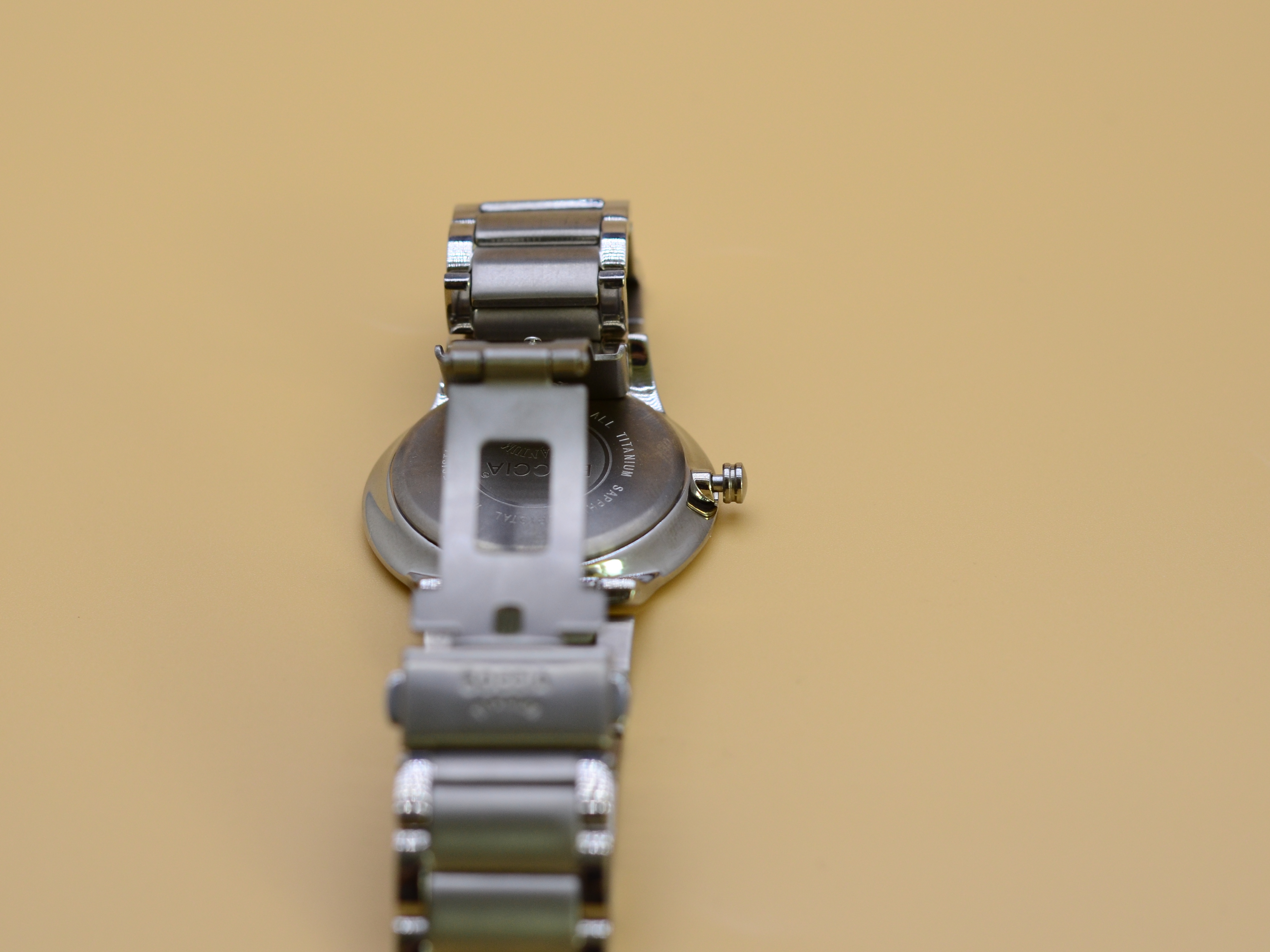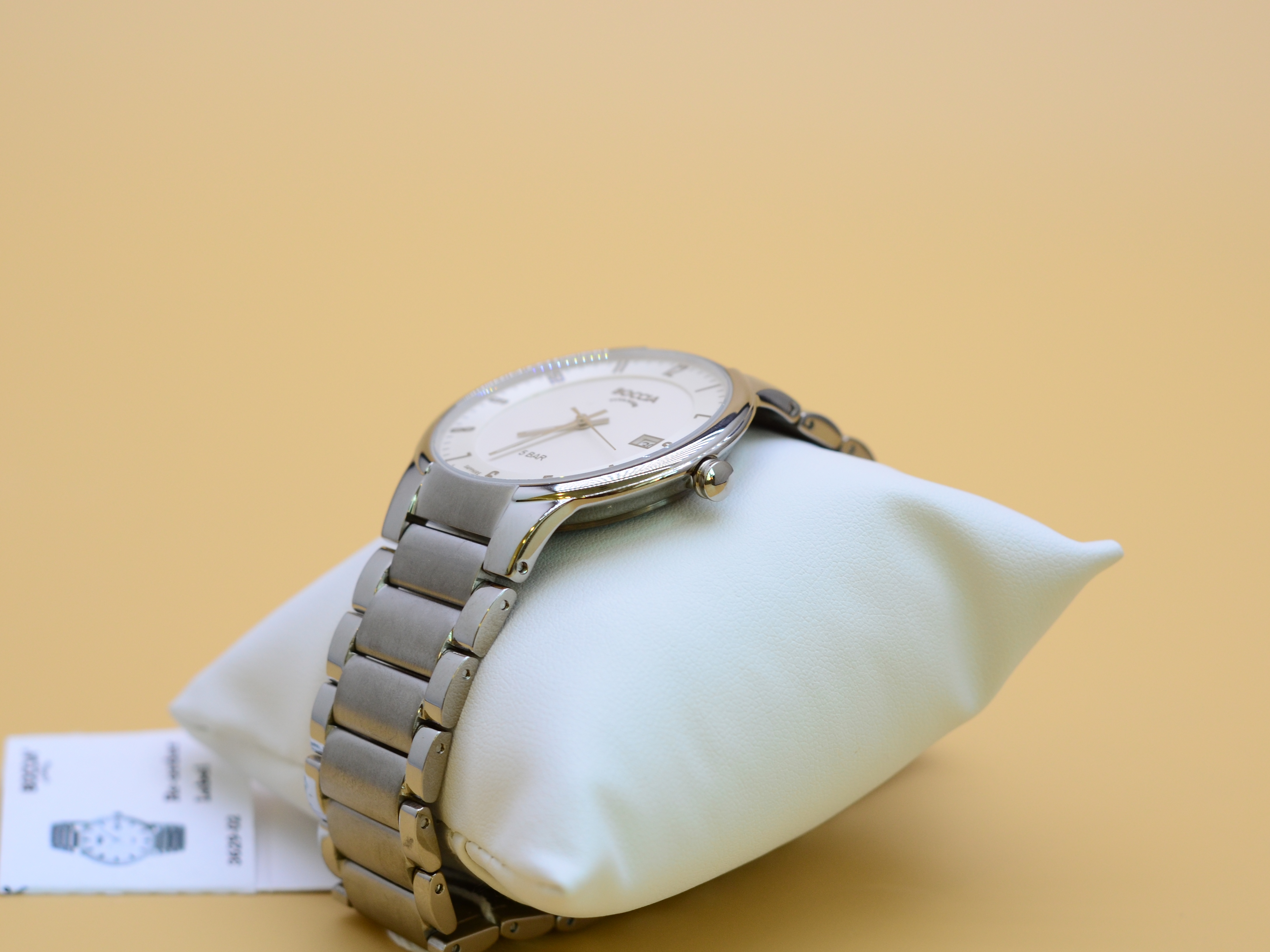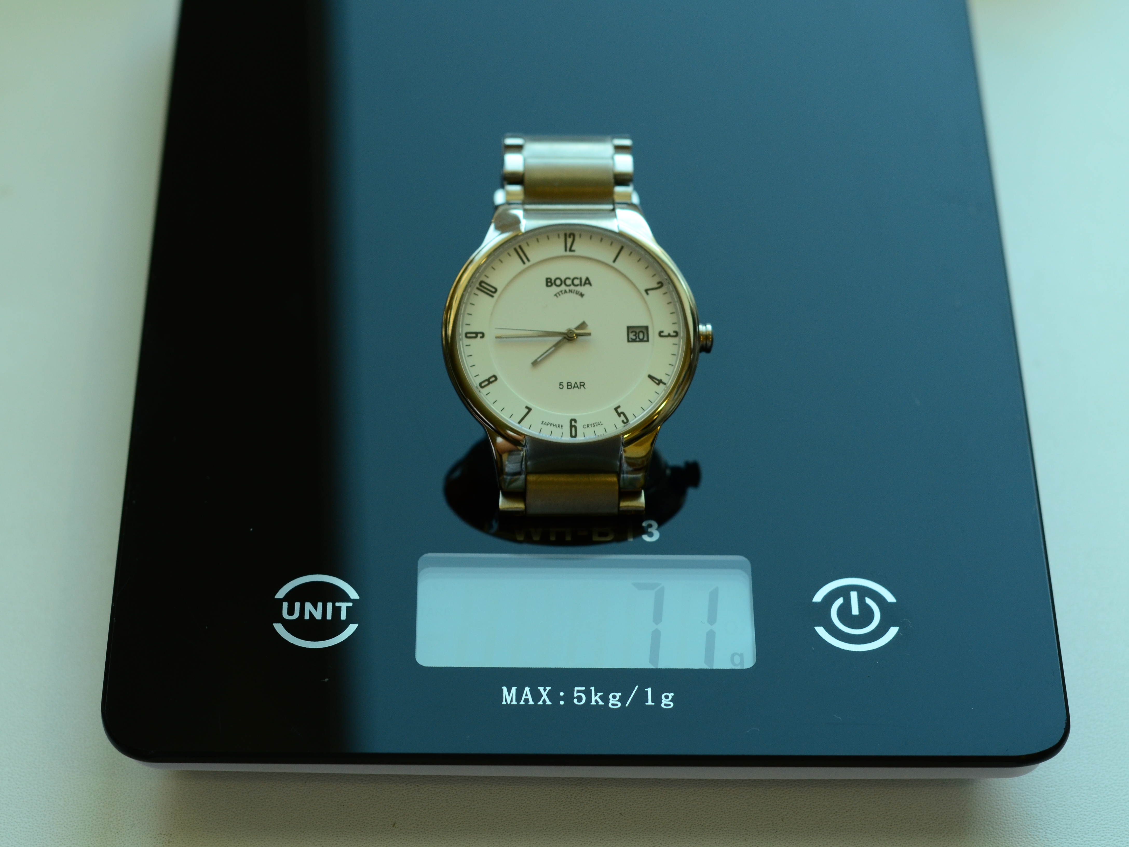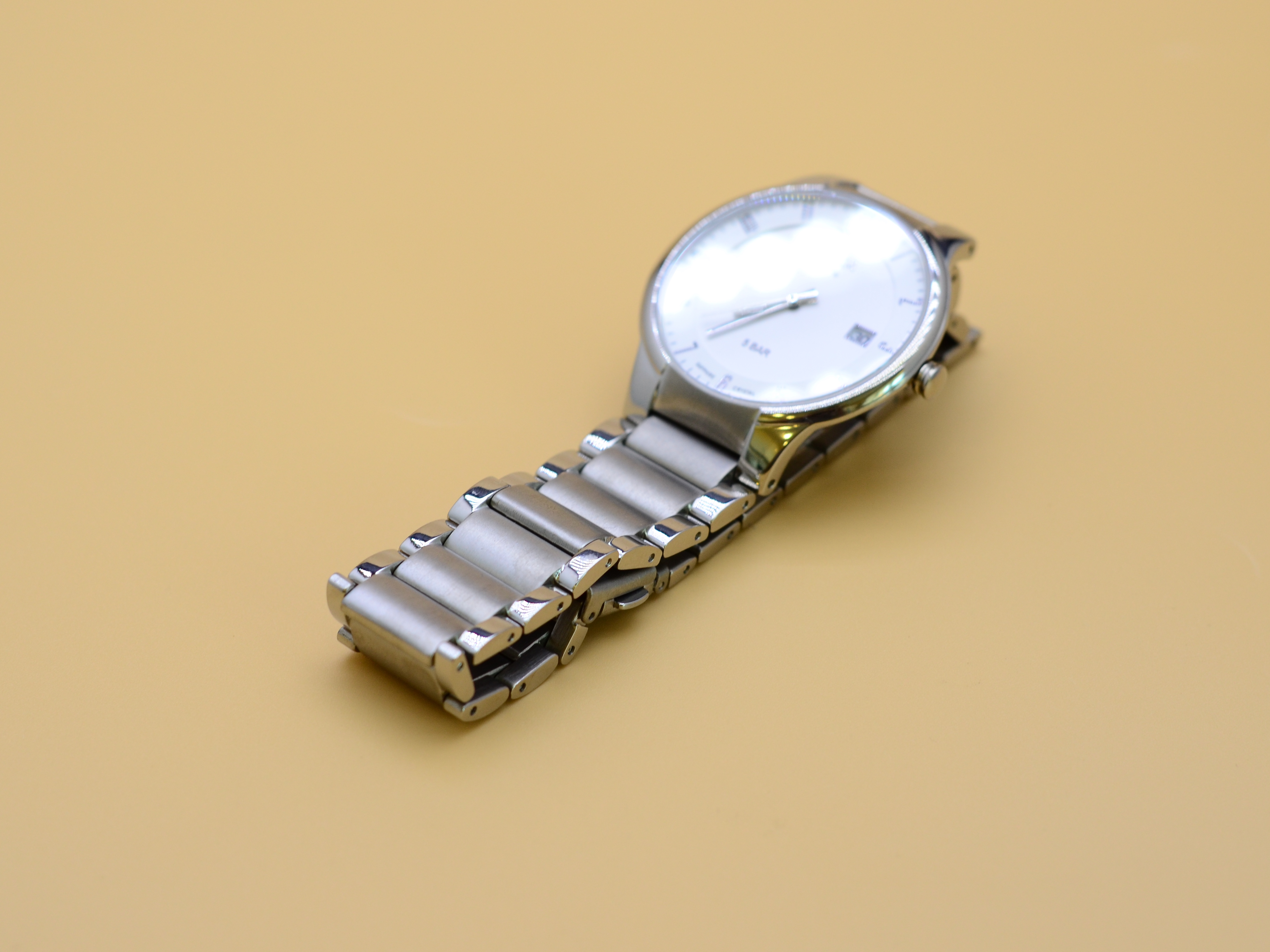 Циферблат часов не перегружен лишними механизмами, этим часы меня и привлекли. Белый циферблат с цифрами того же цвета что и корпус с браслетом и минимальное окошко для даты — классика во всей красе. На циферблате красуется логотип BOCCIA и информация о том, что стекло тут используется сапфировое, а корпус выполнен из титана. Так же тут есть надпись 5BAR, что говорит о том, что часы можно погружать в воду.