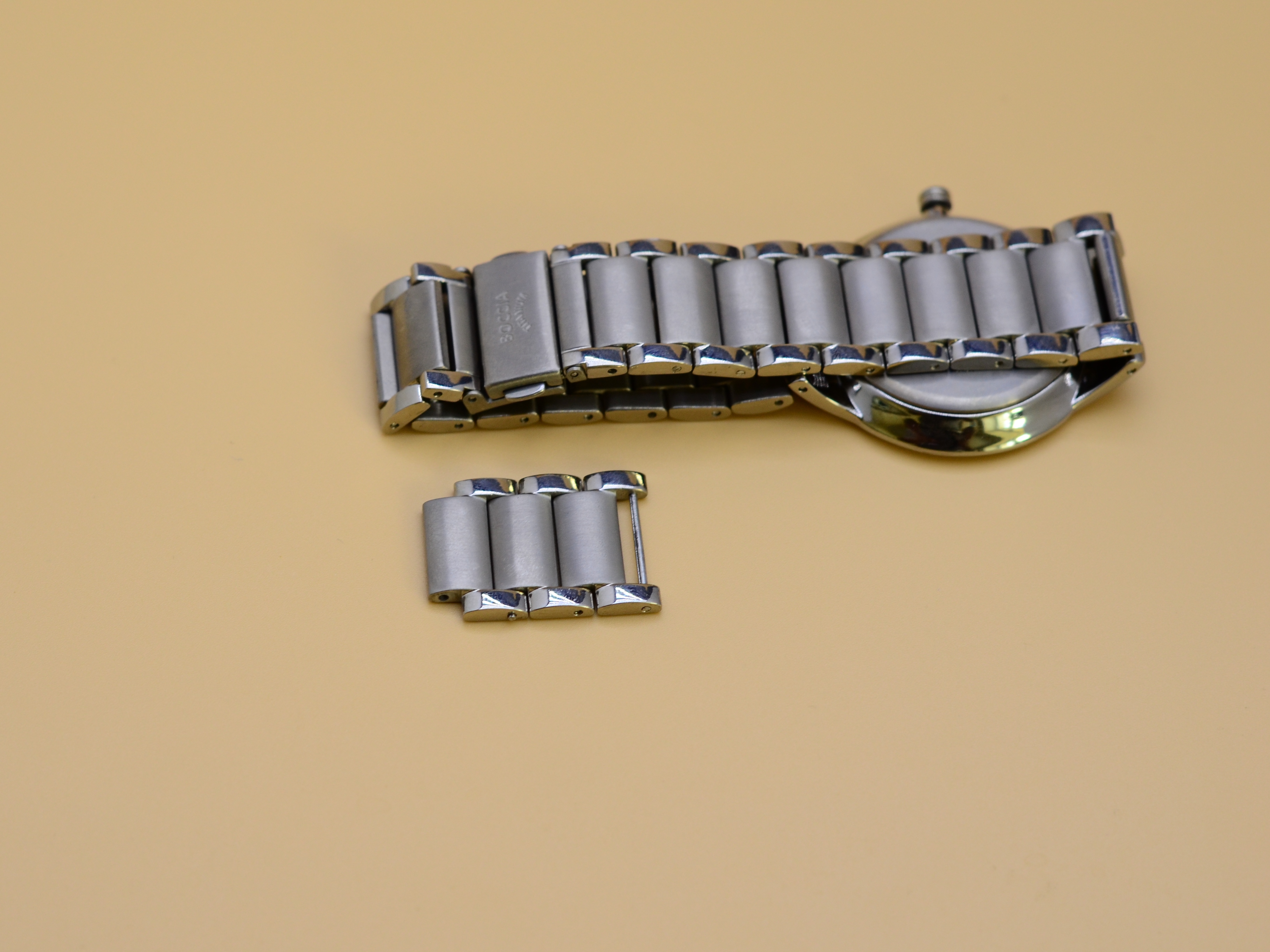 Корпус часов и часть браслета выполнены в глянцевом стиле, центральная полоса браслета матовая.