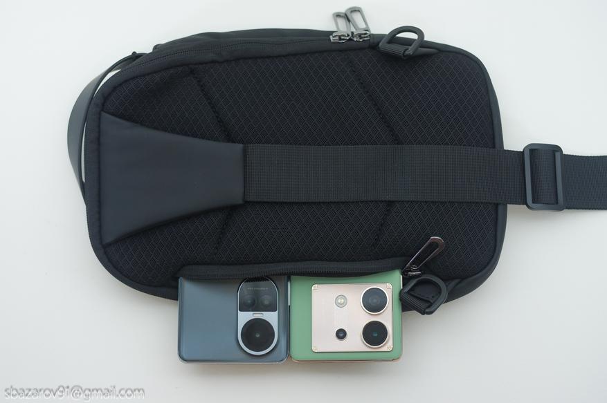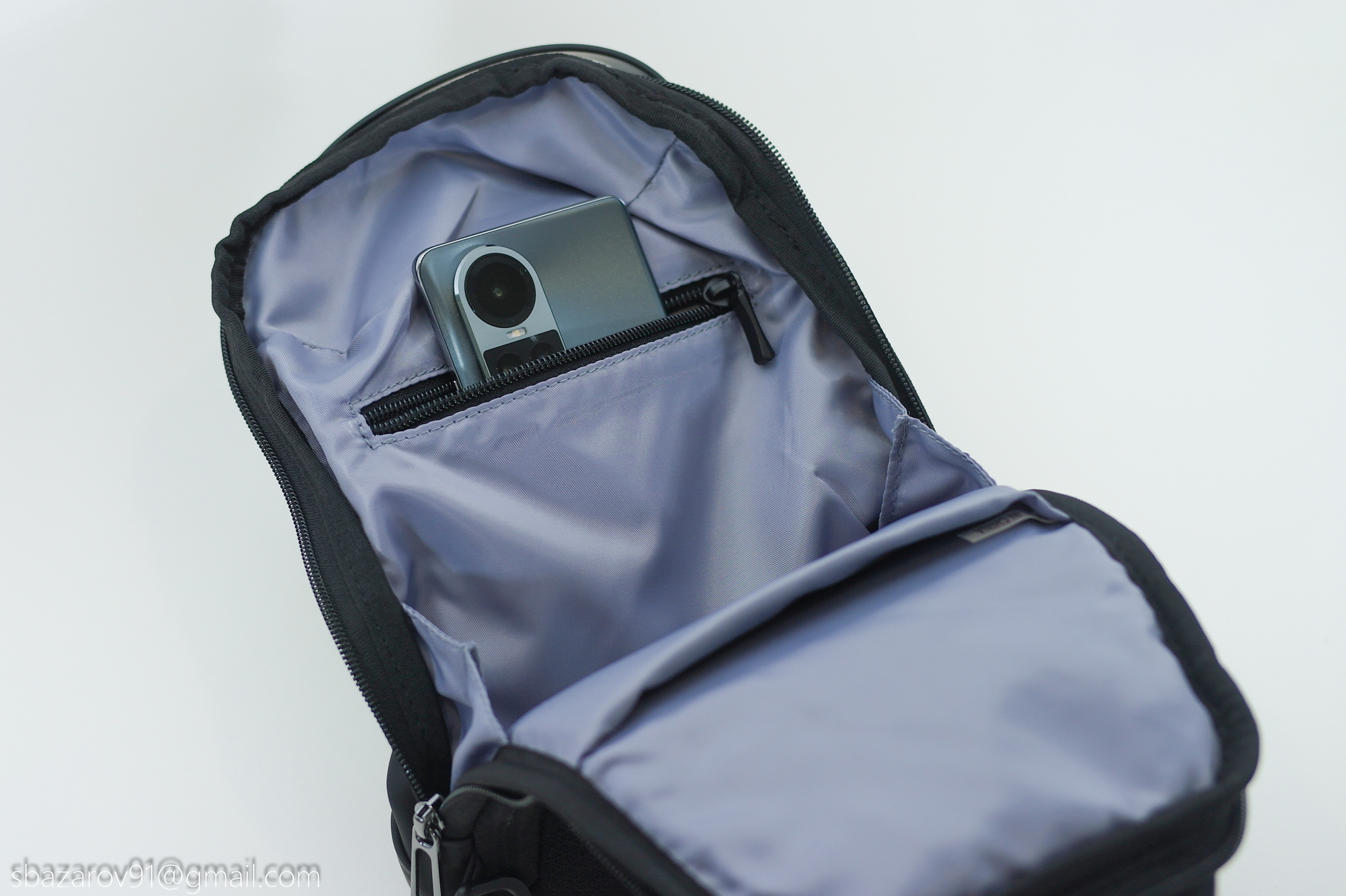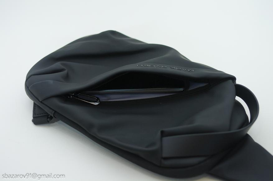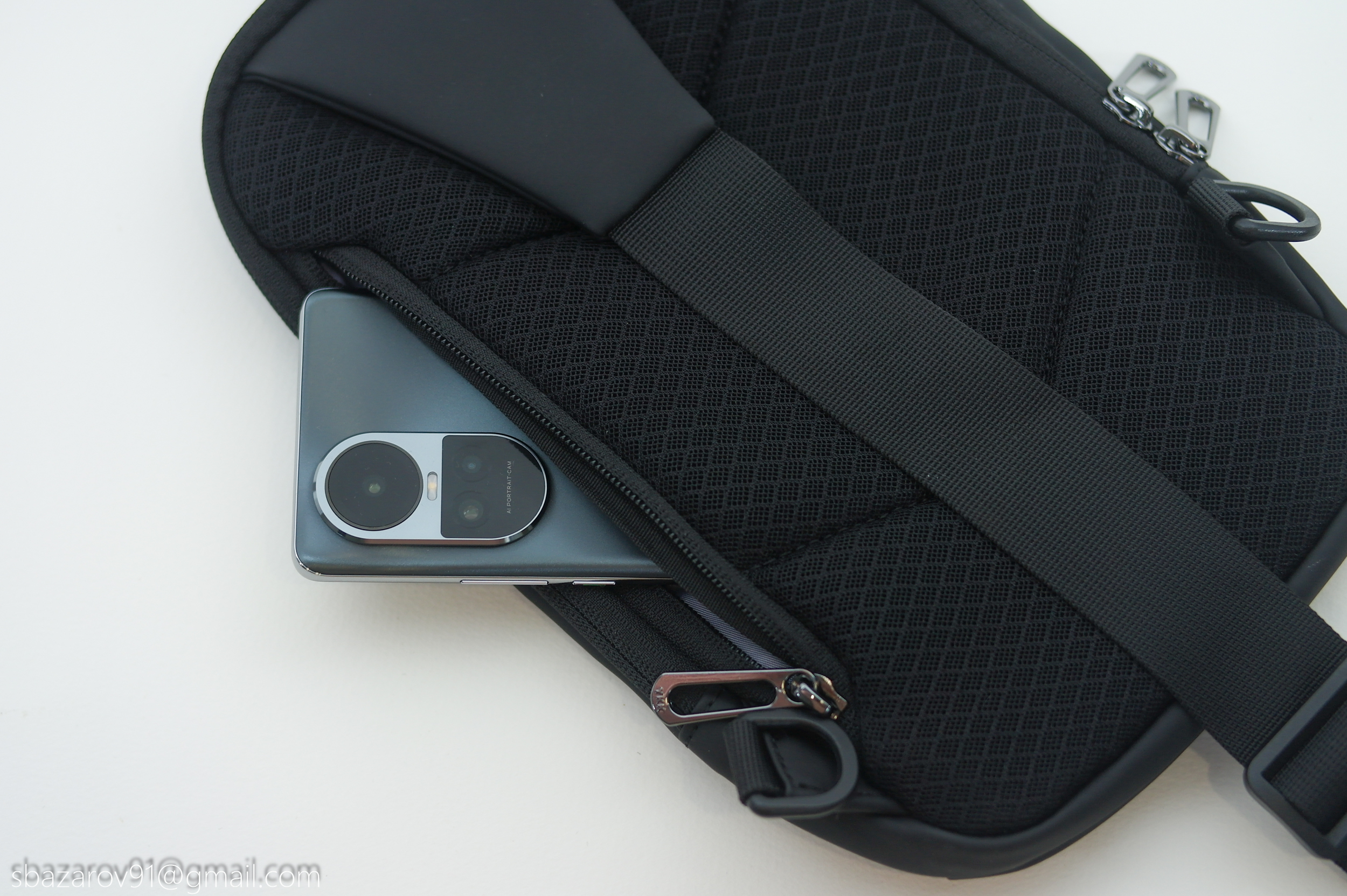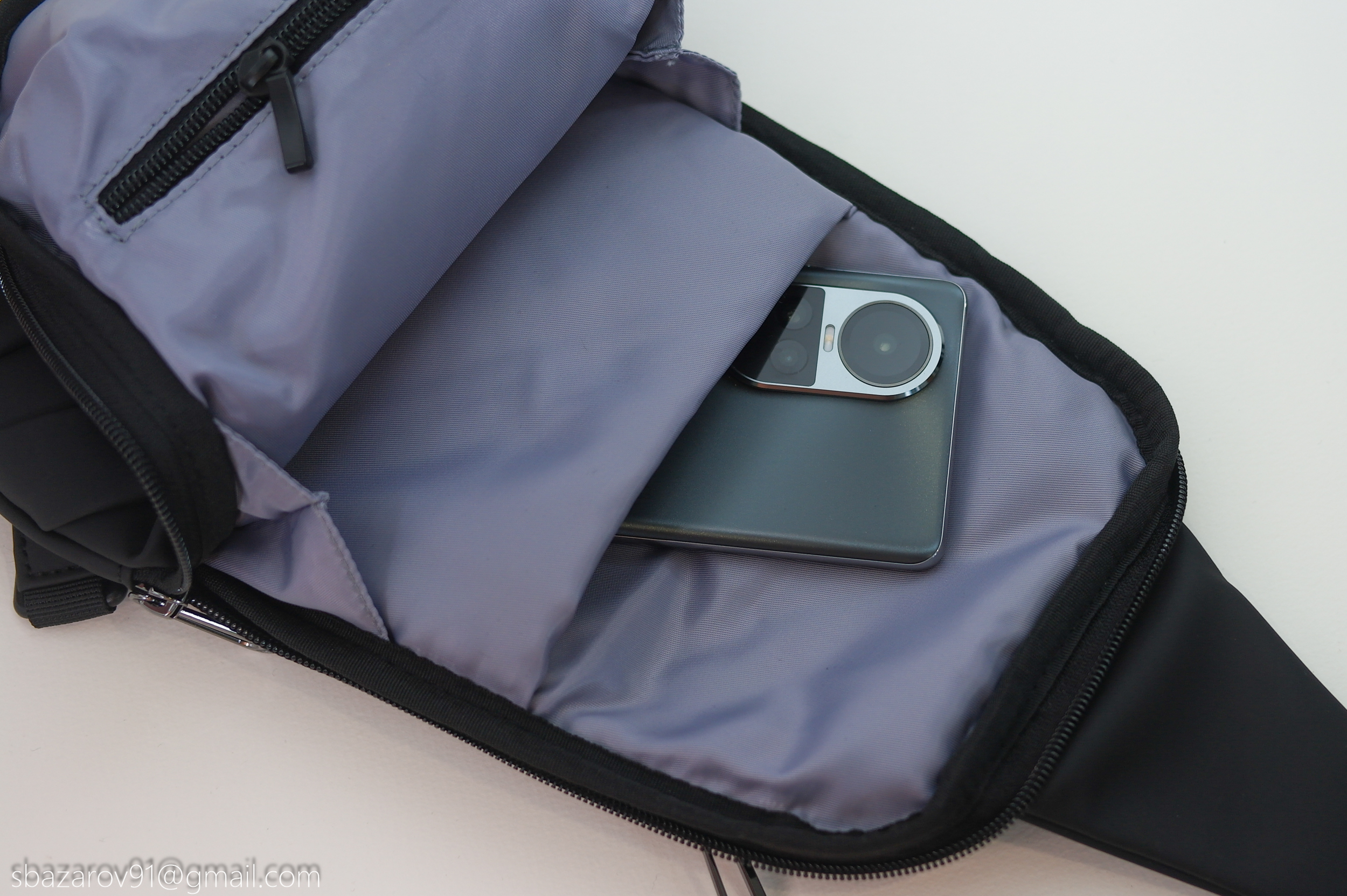 Сумка слинг (альтернативное название однолямочных рюкзаков) имеет один потайной карман на молнии в задней части. Размер кармана идеально подходит для хранения паспорта, кредитных карточек или любых других ценных вещей. При желании в него помещается стандартный телефон с 6.7-дюймовым экраном.