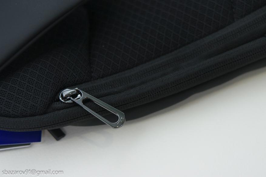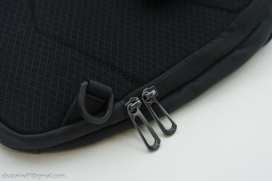 Вся наружная фурнитура (слайдер и пуллер) выполнены из металла, производитель YKK. У основной застежки-молнии сразу два бегунка для удобства доступа к внутреннему карману, на остальных застежках по одному бегунку.