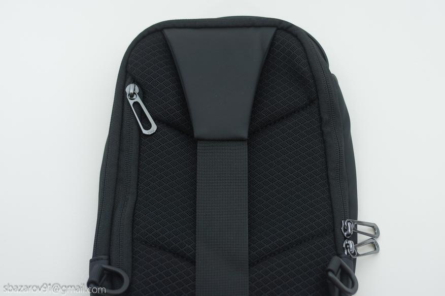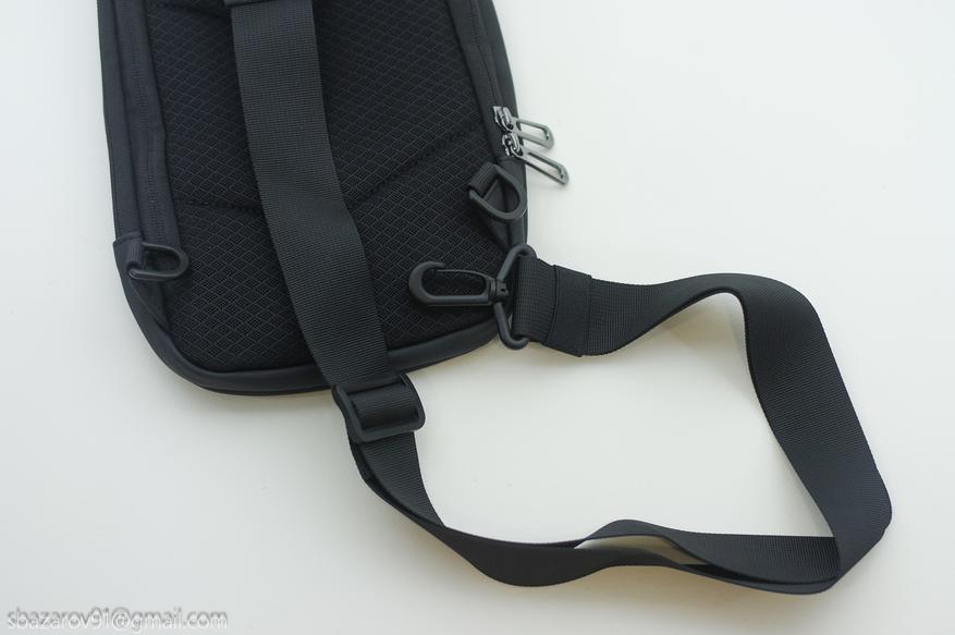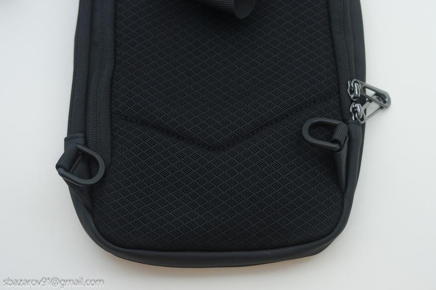 Ознакомимся с задней частью рюкзака, выполненная из дышащей сетчатой ткани. По центру верхней части находится плечевой ремень из нейлона, а по обе стороны снизу проушины для левого или правого размещения. Ремень получил пластиковый карабин и регулировку по длине.