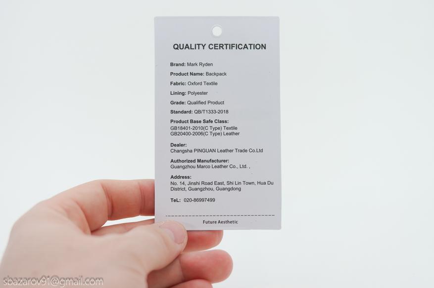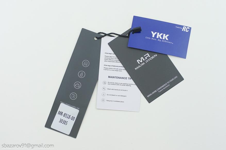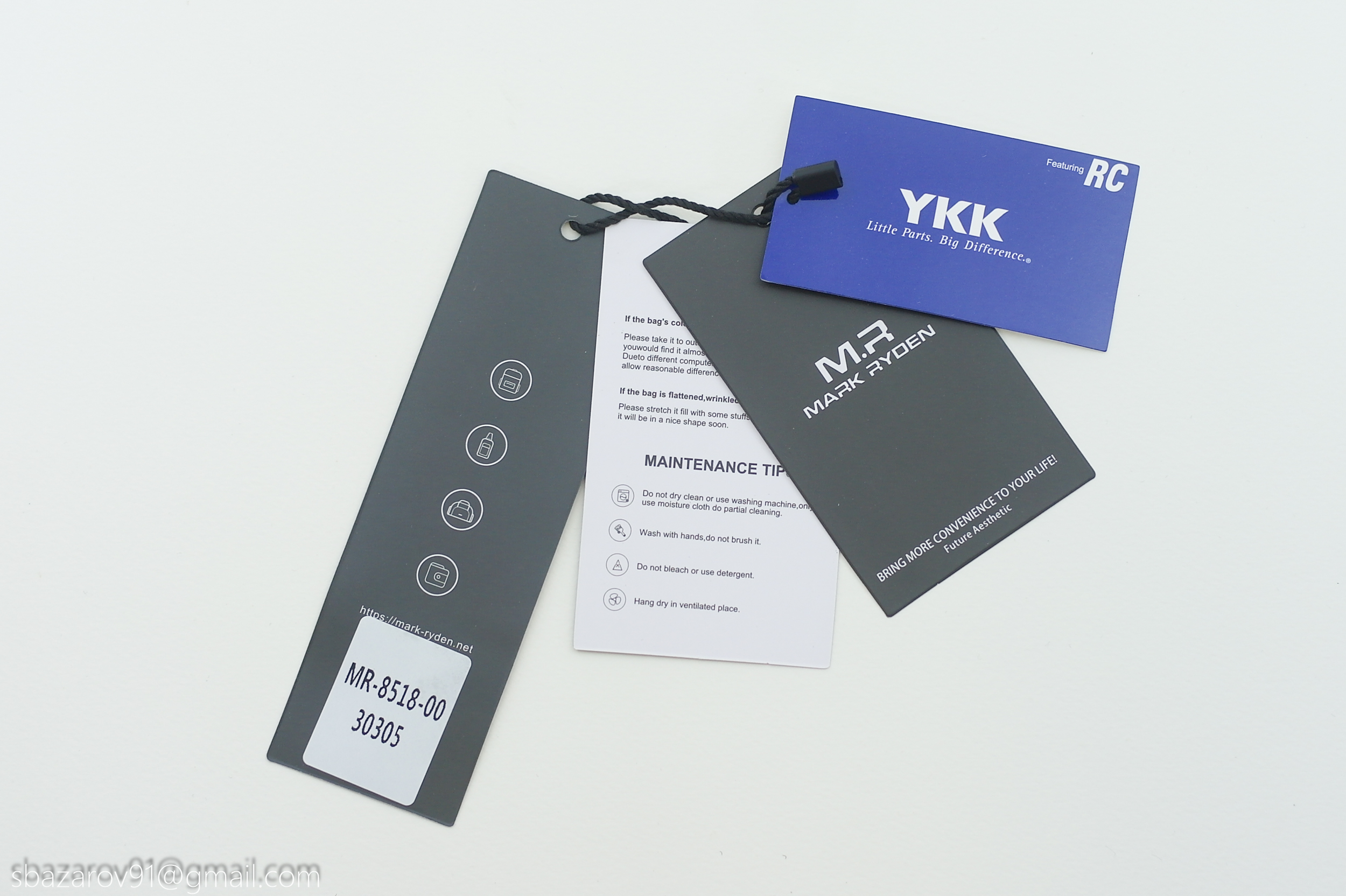 В комплекте с рюкзаком прилагаются бирки от самого производителя и производителя фурнитурой YKK (японский бренд основанный в 1934 году). Для тех, кто впервые слышит о бренде MR, он был представлен публике в 2017 году и специализируется на различных рюкзаках и сумках. К качеству их продукции вопросов у меня нет, их рюкзак MR8057 эксплуатируется мною уже более 4-х лет и пережил несколько десятков перелетов по соседним странам, а также сопровождал меня во множествах отпусков. Поэтому, как только появилось желание приобрести себе однолямочный рюкзак, я незамедлительно обратился к проверенному бренду.