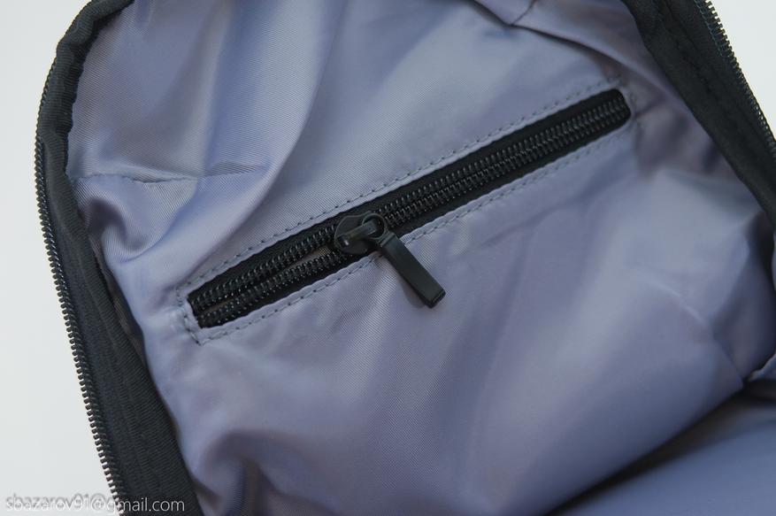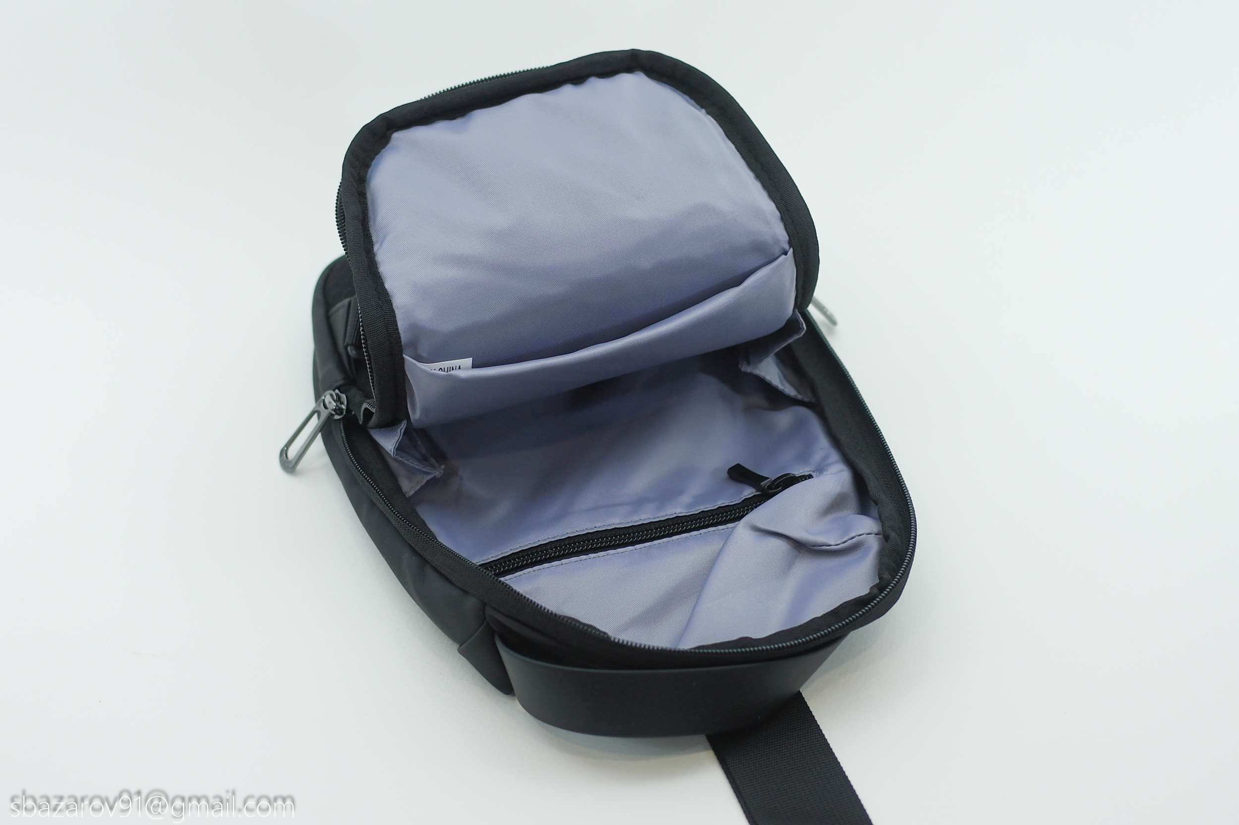 Как было сказано ранее, для доступа к основному отделению предусмотрено сразу два бегунка. Внутренний материал такой же, как и в наружном кармане, то есть из полиэстера. Объем данного отделения — 3 литра, на рынке однолямочных рюкзаков это средний объем, так как существуют слинги как большего, так и меньшего объема.