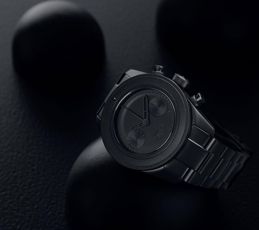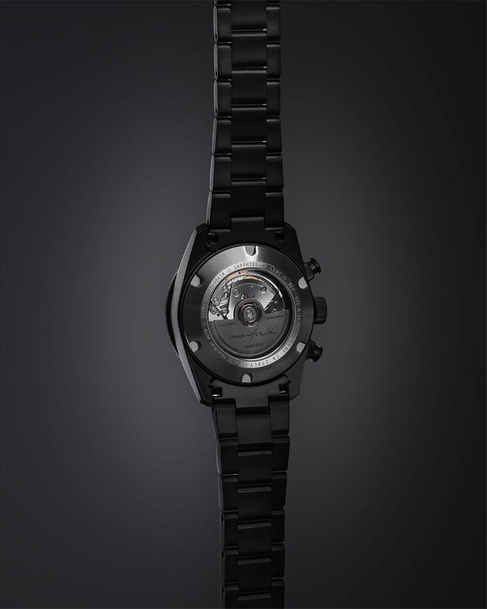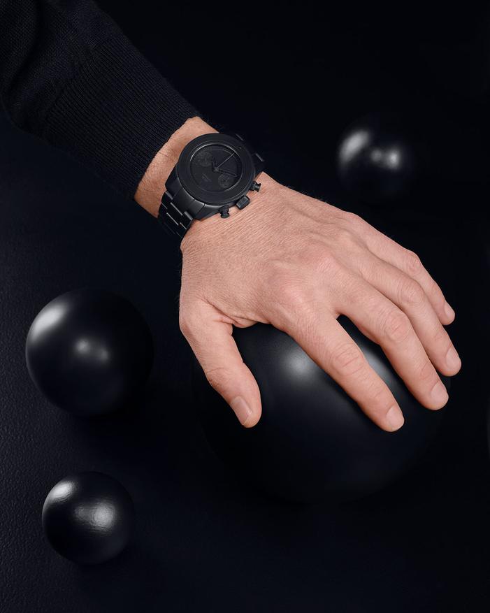 Часы выполнены в монохромной черной гамме. Корпус и браслет изготовлены из нержавеющей стали с DLC-покрытием, обработанным методом пескоструйной обработки. Технология Diamond-Like Carbon обеспечивает повышенную устойчивость к царапинам и коррозии. Матовый циферблат дополнен концентрическими вспомогательными циферблатами для функций хронографа.