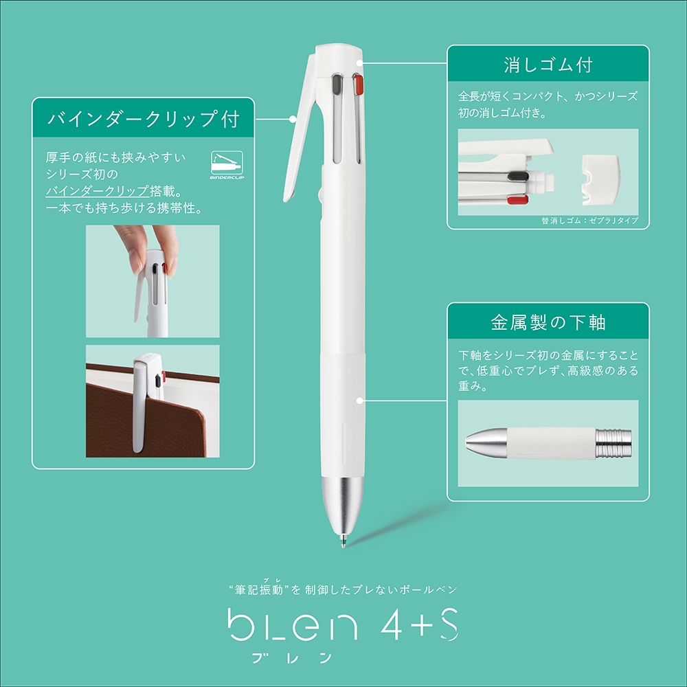 В продаже появилась обновлённая серия шариковых ручек Zebra Blen 4+S. Это многоцветные ручки с механизмом Blen system, который позволяет контролировать размытость, возникающую при соприкосновении шарика пишущего узла с бумагой во время письма. Также это многоцветная шариковая ручка и механический карандаш в одном корпусе.