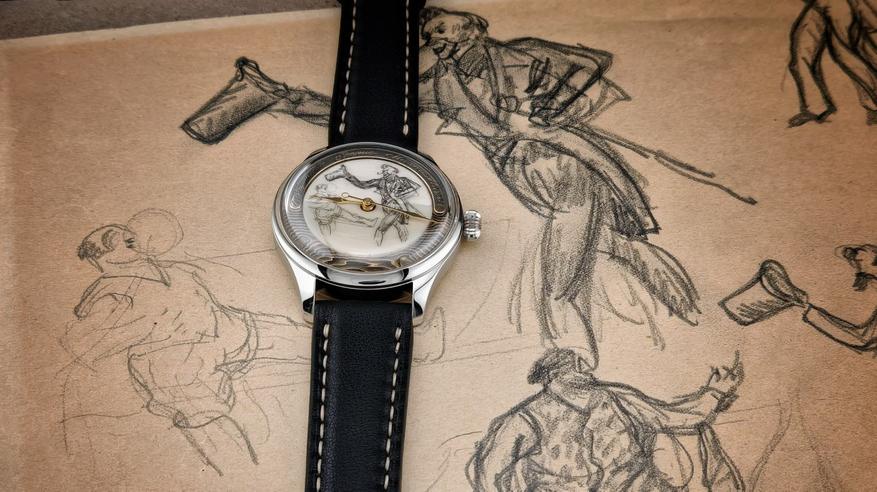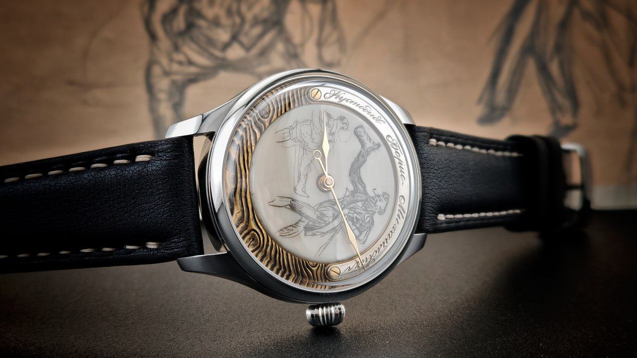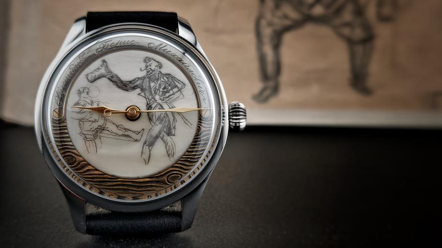 Сам циферблат, декорированный в технике скримшоу, получил внутреннюю раму-безель, ручная гравировка которой имитирует фактуру дерева. Сверху — шильдик из серебра с именем автора рисунка.