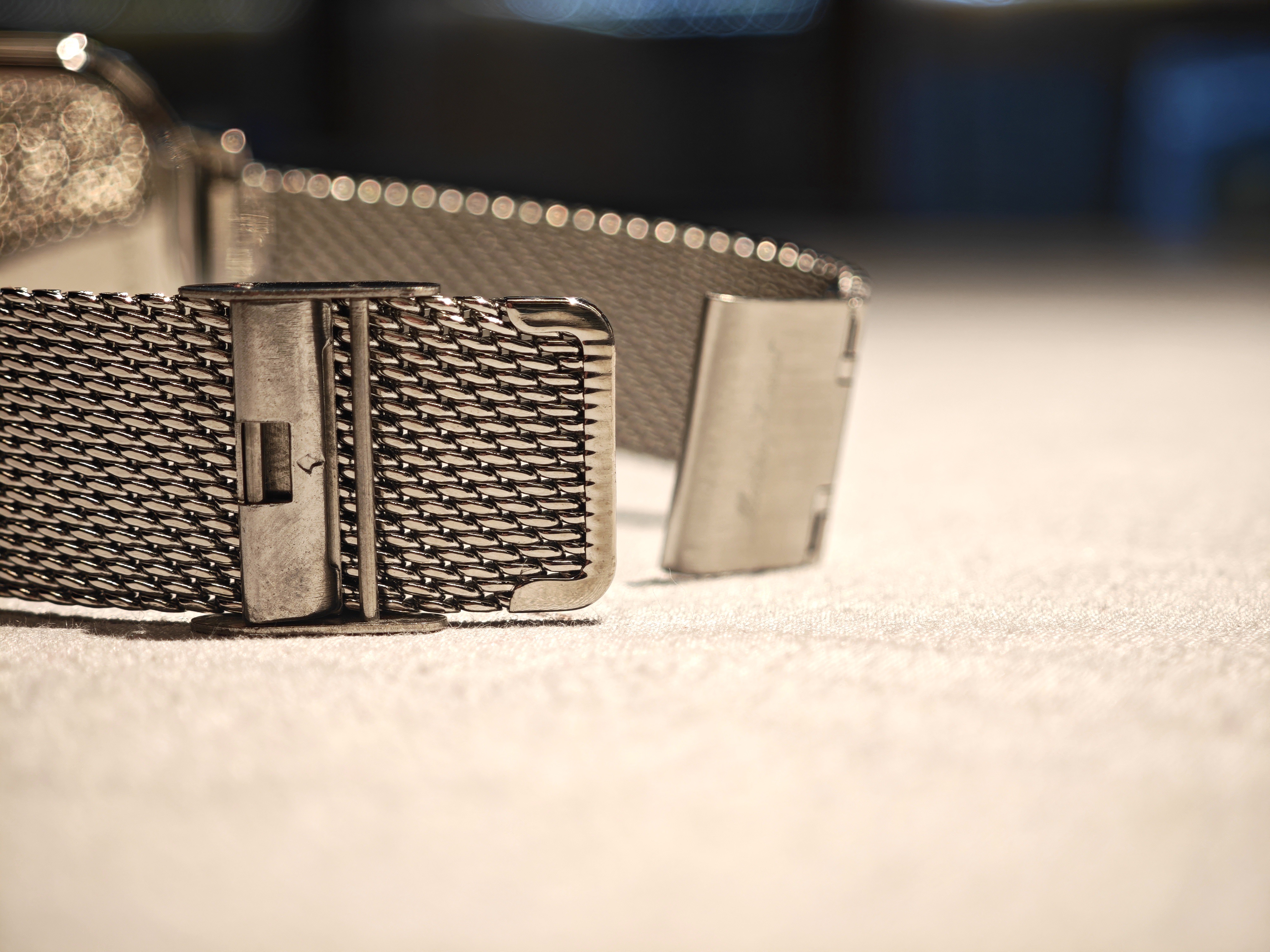 Тонким часам достался и утонченный браслет: это классическое миланское плетение с классической же для такого типа браслетов застежкой.